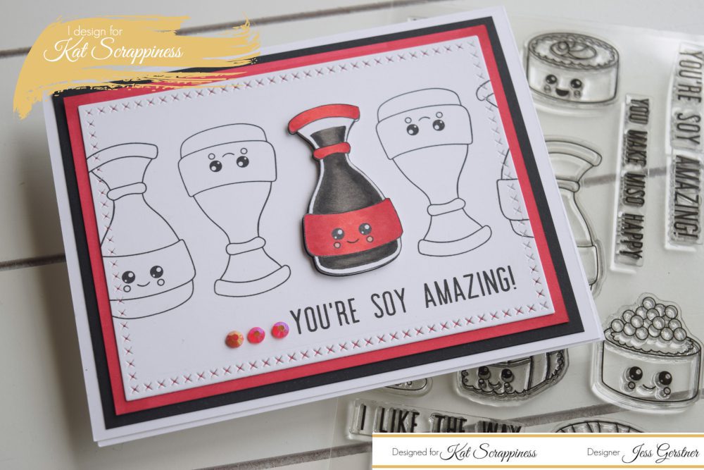 For my card set today I used one of the newest releases from Kat Scrappiness Wok On. This has so many images that are easy to color and also very easy to cut. I fussy cut all the images today. I decided to start with some common things I could do on each card to make the process a bit faster. I decided I would cut the main decorated panel using the Cross Stitched Rectangle die from Kat Scrappiness. Then I added a layer of colored cardstock and a layer of black to each card. The extra layer of mats helps the cards pop a bit and makes them clean and simple designs carry a bit more visual weight.
