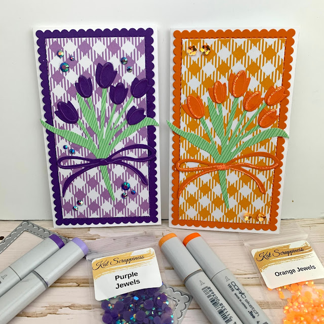 I have two Tulip Monochrome Cards to share with you using the Tulip Dies and Easter Parade Slimline Paper Pad from Kat Scrappiness to inspire you to join this month’s challenge. The theme is Flowers. I hope you get your Kat Scrappiness goodies out and join us!