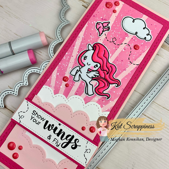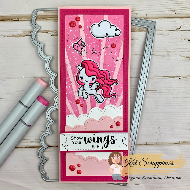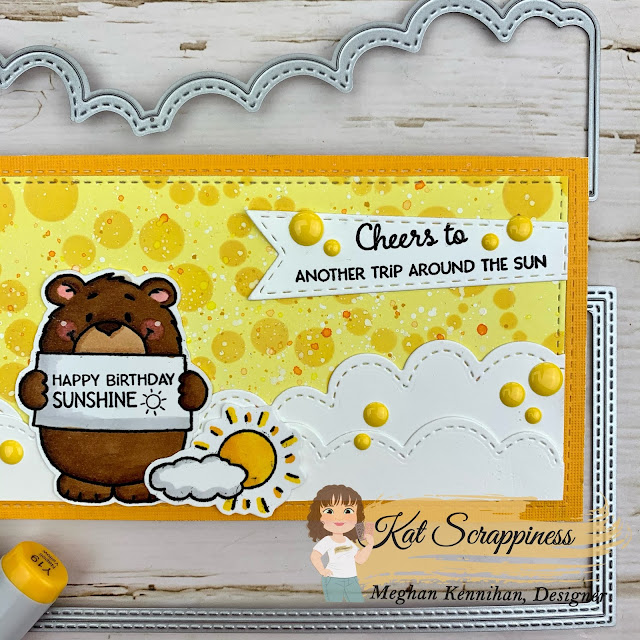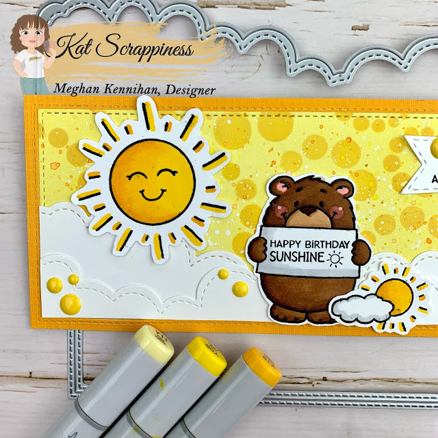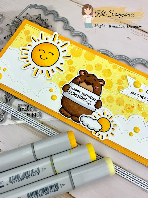 I’m sharing more inspiration using Kat Scrappiness NEW Spring Release! I LOVE the new Slimline Cloud Dies. I made TWO cards using them. One features the NEW Gerda Steiner Hello Sunshine Stamp in store and the other is an explosion of pink!