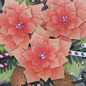 The Poinsettias I inkblended partly, leaving the tips of the petals as is. I used a rouge and soft red to give the Poinsettias more definition. The hearts were filled with Ruby Red Rhinestone Mix, using seven of the smallest stones per flower for sparkle.
