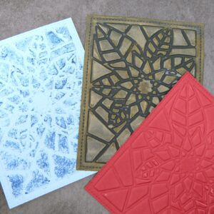 To create the backgrounds, I used the die to emboss instead of cut. This technique gives a beautiful, deep impression, as you can see in the photo. I made three embossed backgrounds — red for Card 1, black for Card 2, and blue for Card 3. Keeping it simple but striking!