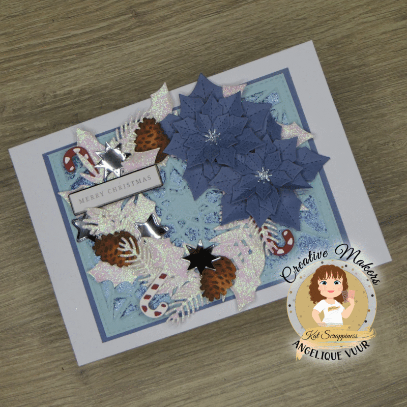 For the blue background, I kept things simple and sparkly. I die-cut two small poinsettias from blue cardstock and didn’t ink-blend them. The hearts were cut from light blue glitter cardstock for that extra shine. The Poinsettias I folded slightly different then the poinsettias of the two other cards.