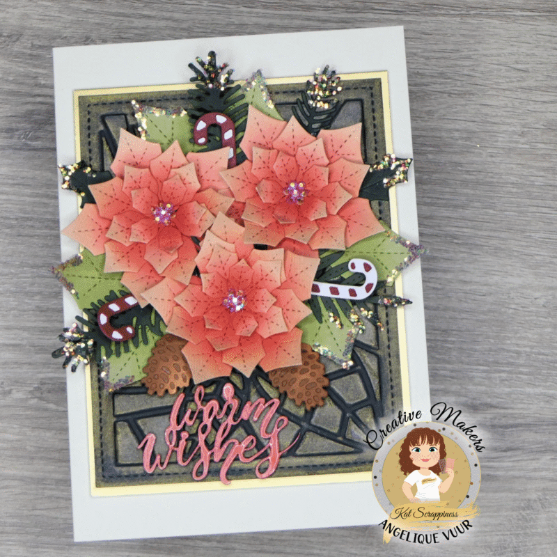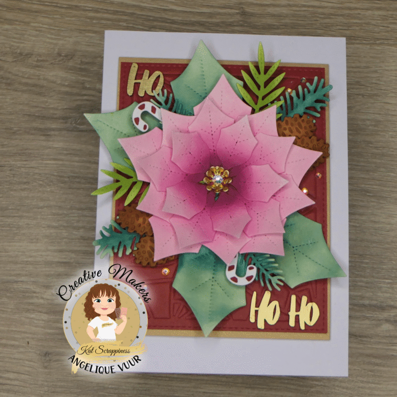 Hearts colored with a gold marker And I Used one big Rhinestone from the Chrystal AB Rhinestonemix in the heart of the poinsettia.