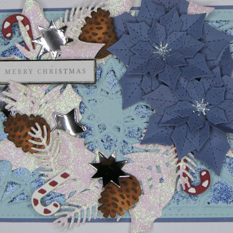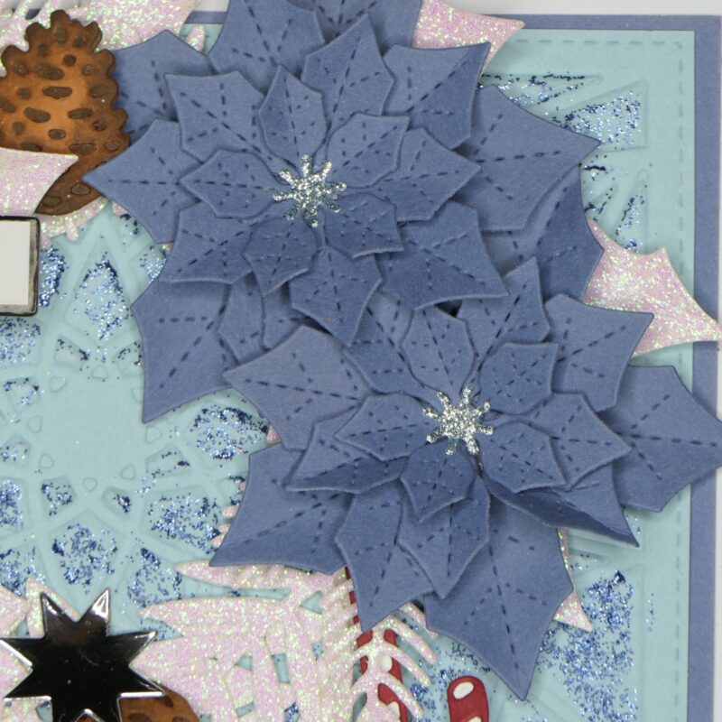 Optional: mat the finished design with blue cardstock (matching the poinsettias) and adhere to an A7 cardbase. The foliage already has plenty of glitter, so I didn’t add any extra embellishments.
