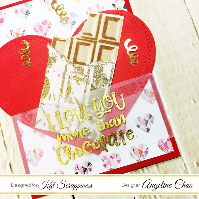For today’s card I thought it’ll be good to move on to the next holiday coming soon — which is Valentine’s Day — using the NEW Kat Scrappiness Layered Chocolate Bar stamp from her Chocolate Lover’s Card Kit by Kat Scrappiness.