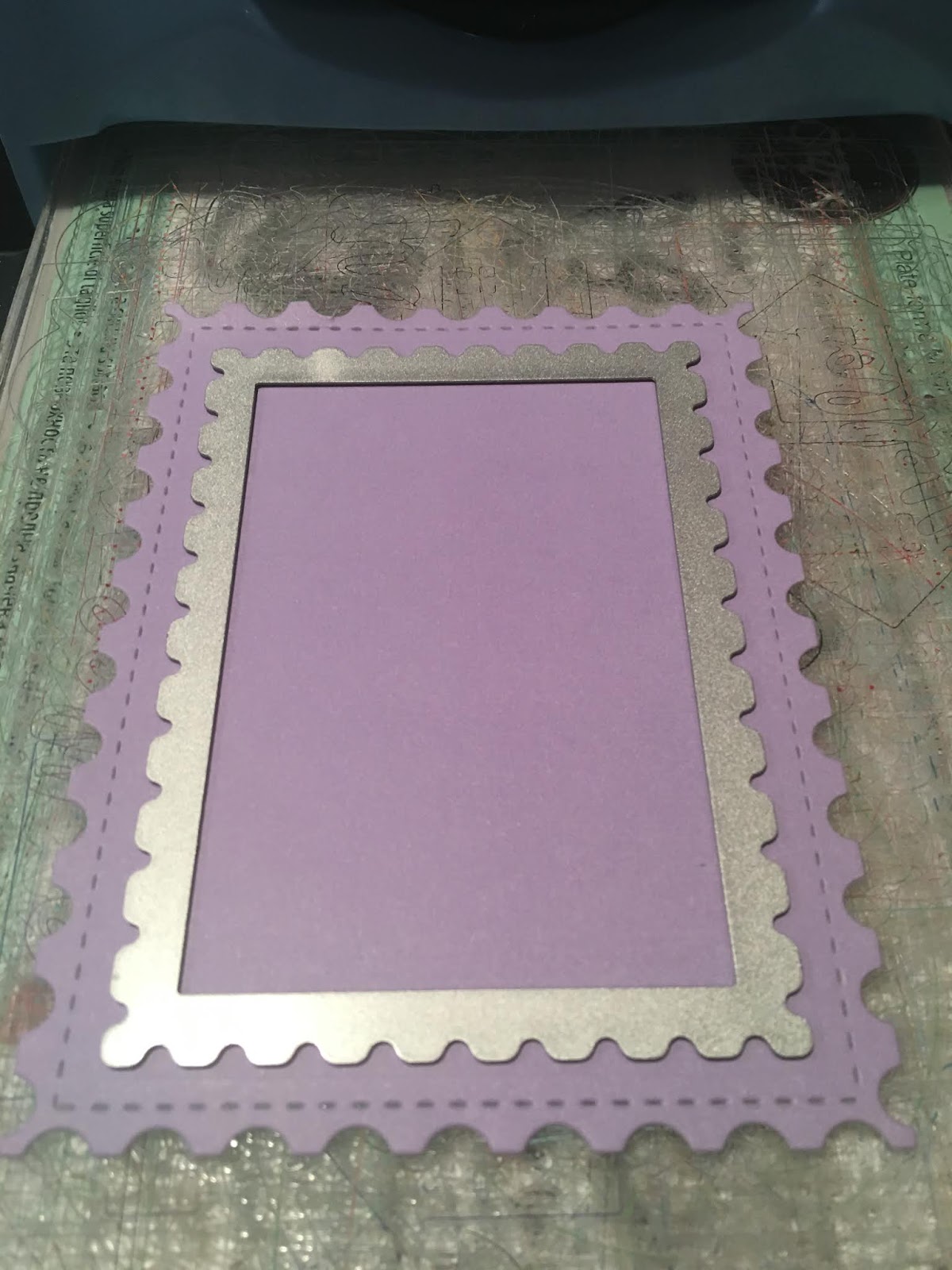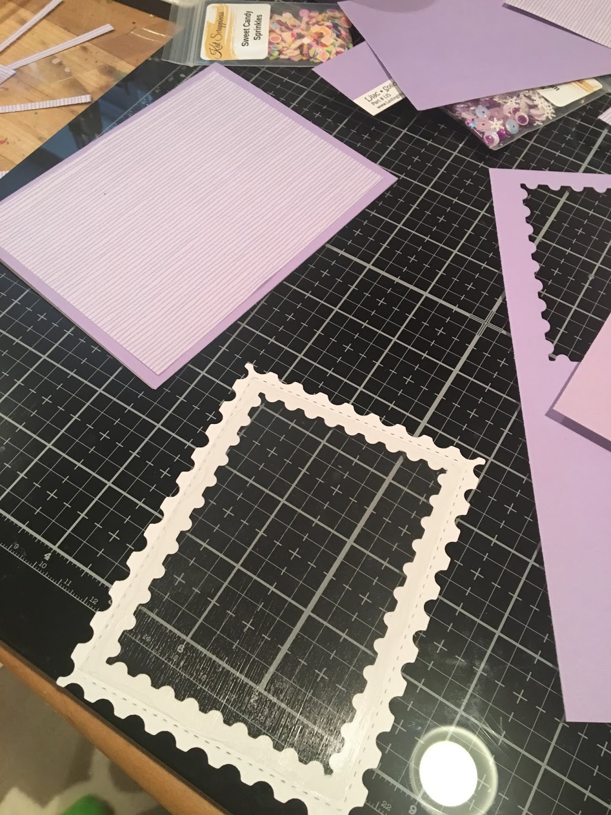 First, I die cut the frame using the Kat Scrappiness Stitched Postage Stamp Edge Rectangle Die, I die cut the larger one first then I nested the next size down in the middle and die cut it again. I used the same paper as my base. Next, I added the acetate and foam tape to create my shaker piece.