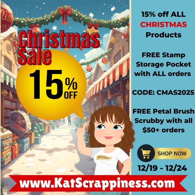 Join us in what could be the last sale of the year here at Kat Scrappiness. 15% off all Christmas products! FREE STAMP STORAGE Pocket with ALL ORDERS! Spend $50 or more and get a FREE Petal Brush Scrubby. Use CODE: CMAS2025