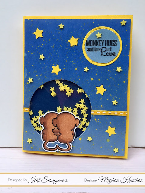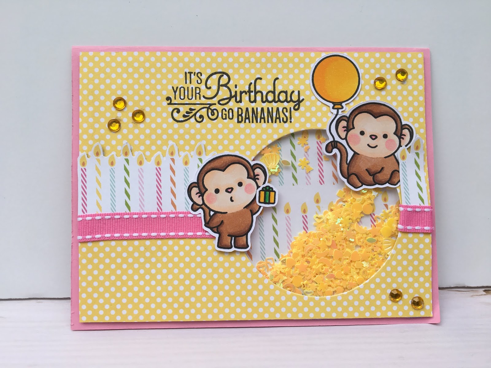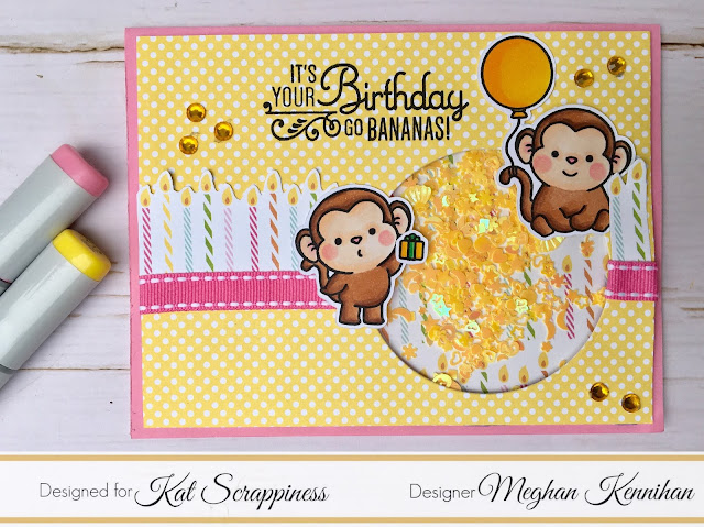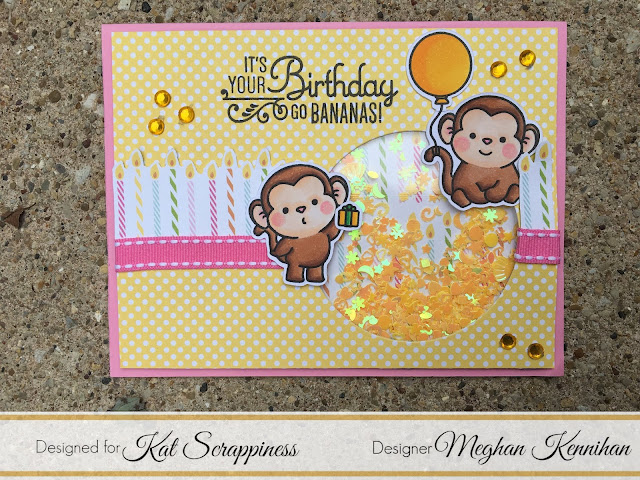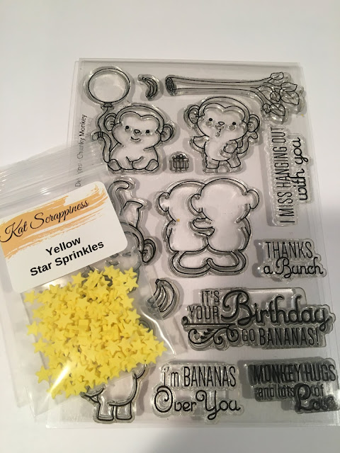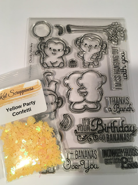 I have two FUN shaker cards for you! Kat Scrappiness just released 38 NEW sprinkles and sequins so I wanted to show you what you can do with them!!! I used this darling stamp set that is in the Kat Scrappiness Store called Chunky Monkey by Sugar Pea Designs. Details and how-tos below!