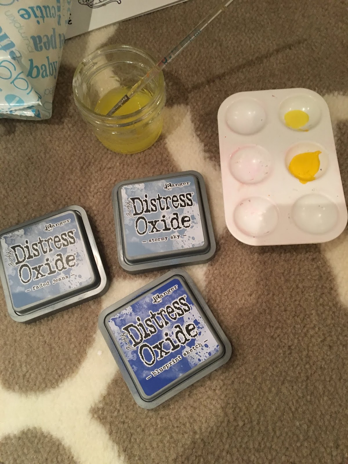 I started my card by inking the panel with the Distress Oxide Inks below. Then I splattered the panel with two shades of acrylic yellow paint. I cut the circle from the bottom of the panel and added the acetate on back for my shaker. I placed the Yellow Star Sprinkles in the center and adhered the panel to my base with foam tape.