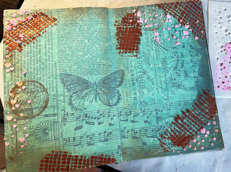 - Added texture with embossing pastes and the Kat Scrappiness Love is in the Air and Burlap Background stencils.