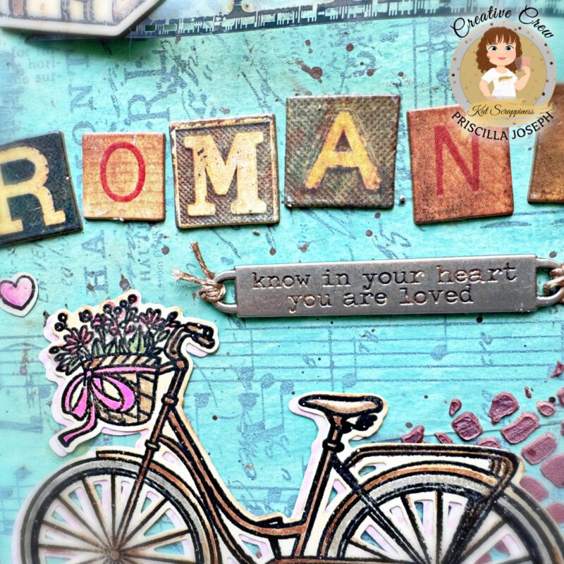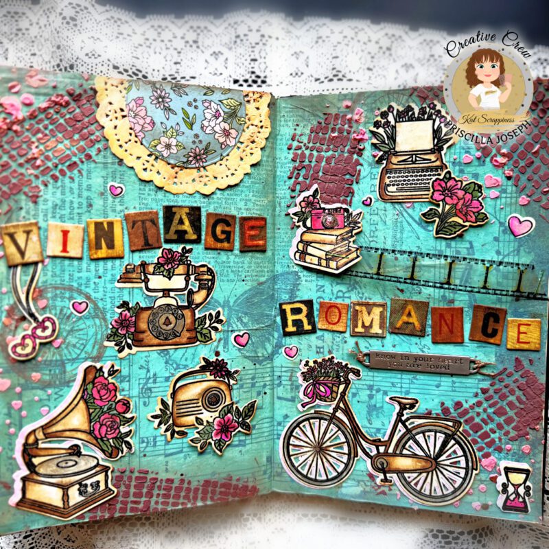 Hello Crafty Friends! Priscilla here from Nubble Light Designs. Today I am sharing a two-page “Junk Journal” spread with a “vintage vibe” using several products from the Kat Scrappiness “Vintage Romance” collection of stamps, dies, and patterned papers. Sometimes it’s just fun to take a break from clean and simple card making and get messy! And with junk journaling, there are no rules! Enjoy!