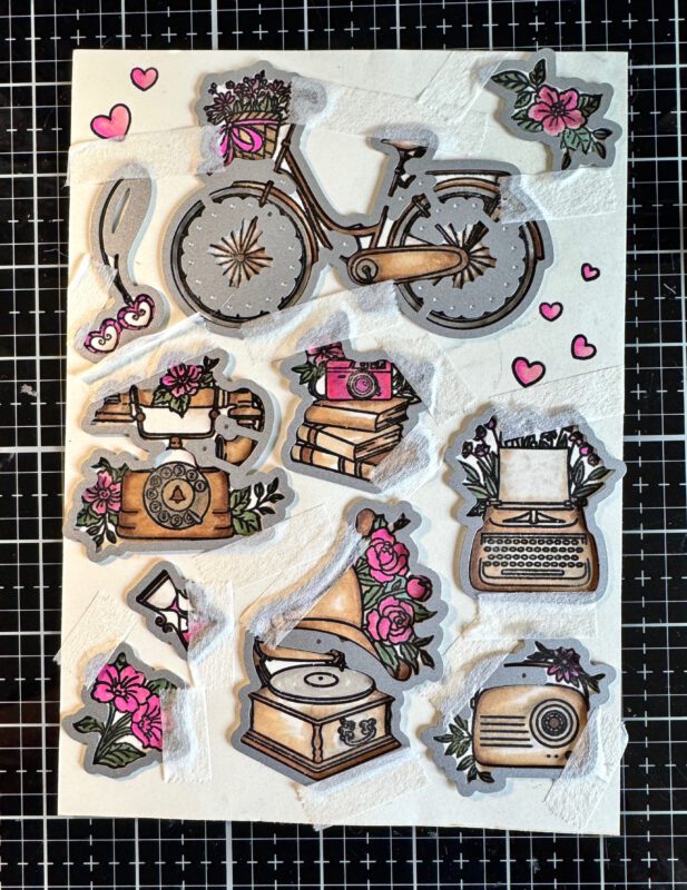 - Colored the stamped images from the Vintage Romance collection with Copic Markers and die cut them out with the coordinating dies.