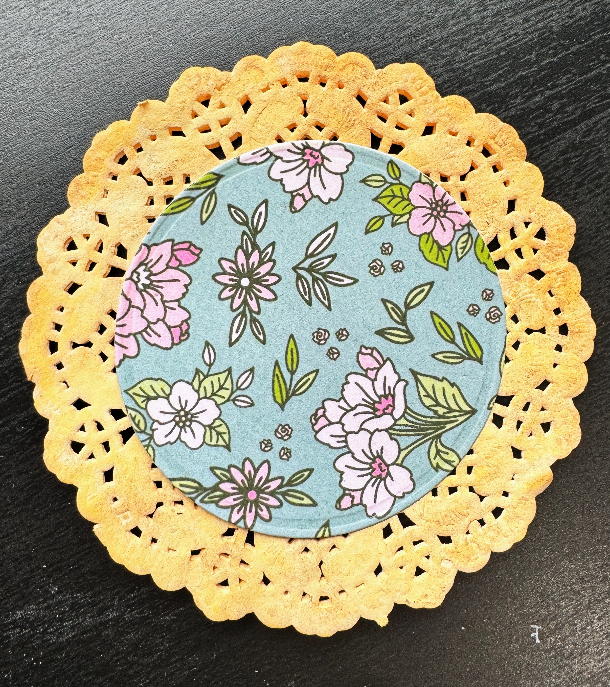 - Created a medallion element by staining a white doily with tea colored ink and then adhering a a circle of patterned paper from the Vintage Romance paper pad over it.