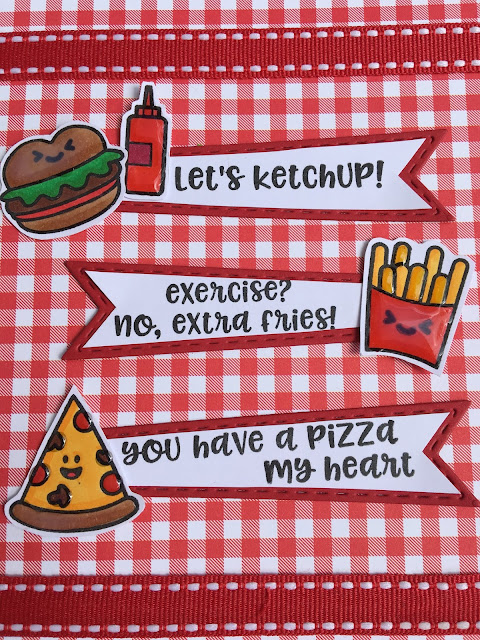 I started by finding a pattern paper that looks like a picnic tablecloth for my panel. I colored up the little food images and fussy cut them out. I matched them with their sentiments which I stamped on the Kat Scrappiness Stitched Flag dies. I finished the card by adding some glossy accents to the stamps and strips of ribbon across the top and bottom.