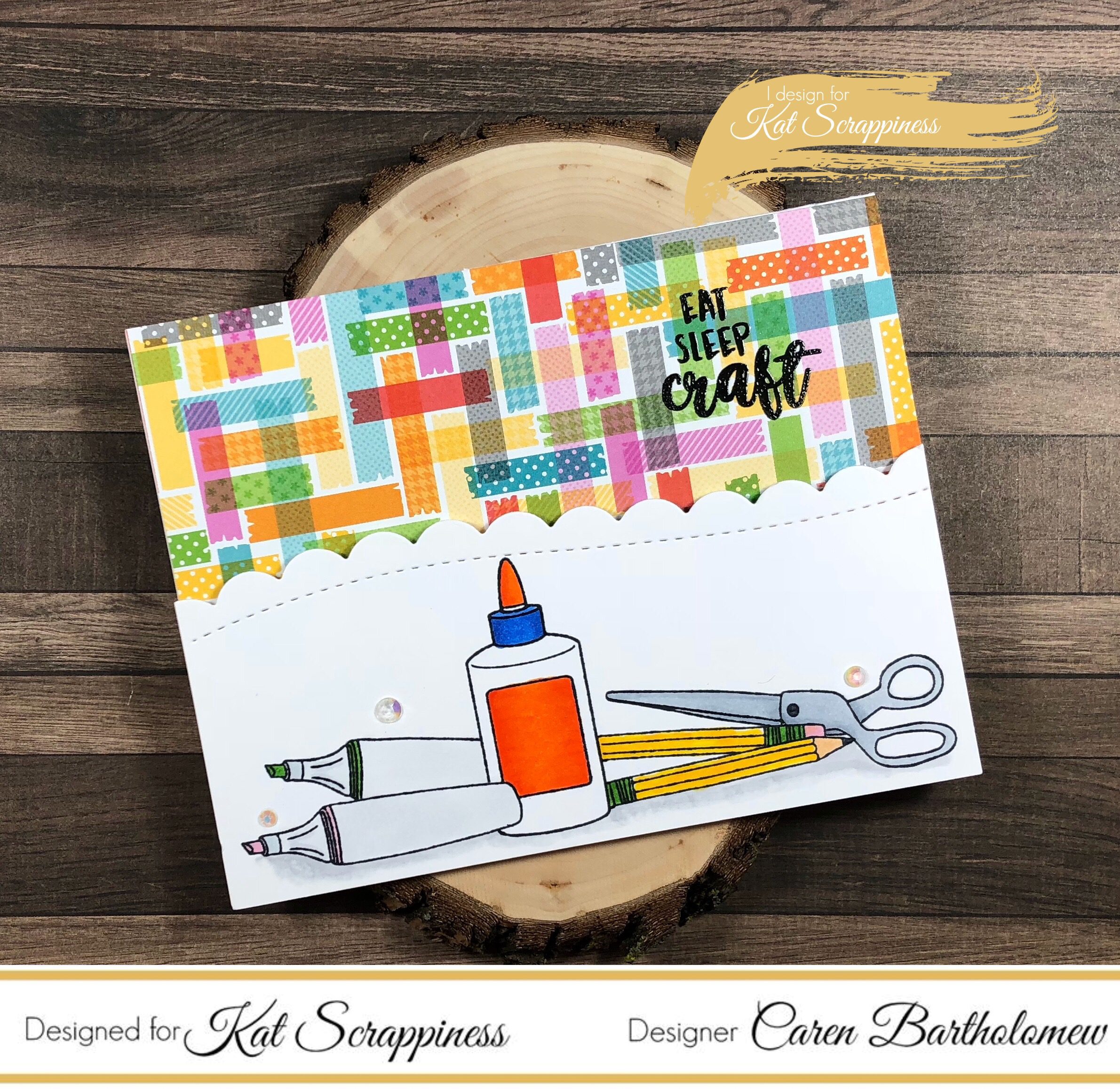 Hi Everyone! Today I have a fun crafty card featuring two just released items at Kat Scrappiness – Crafters Gonna Craft stamp set and Stitched Scalloped Borders.