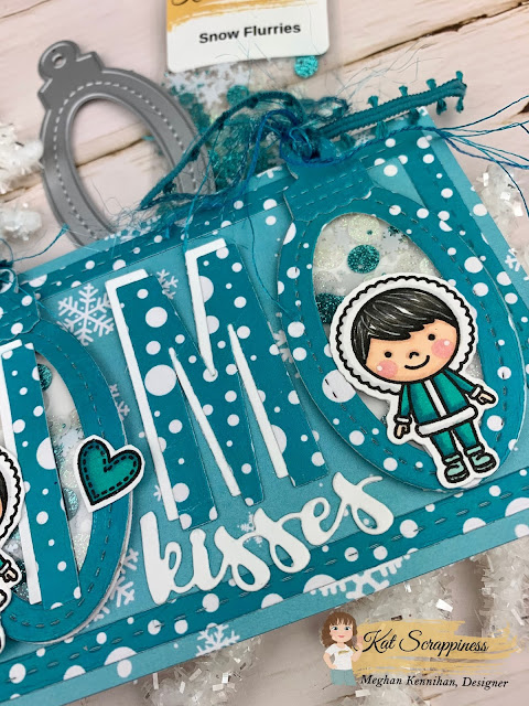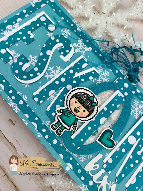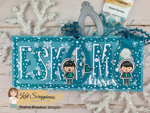 I have a fun ESKIMO card for you today featuring tons of amazing Kat Scrappiness goodies! I just love the Kat Scrappiness Condensed Uppercase Alphabet dies! You can make so many words and they look great on a slimline! I used the Kat Scrappiness Ornament Shaker Dies to create the “vowels” in Eskimo. The papers from the Kat Scrappiness Sugar Plum Fairy Slimline Paper Pad are PERFECT for all winter cards.