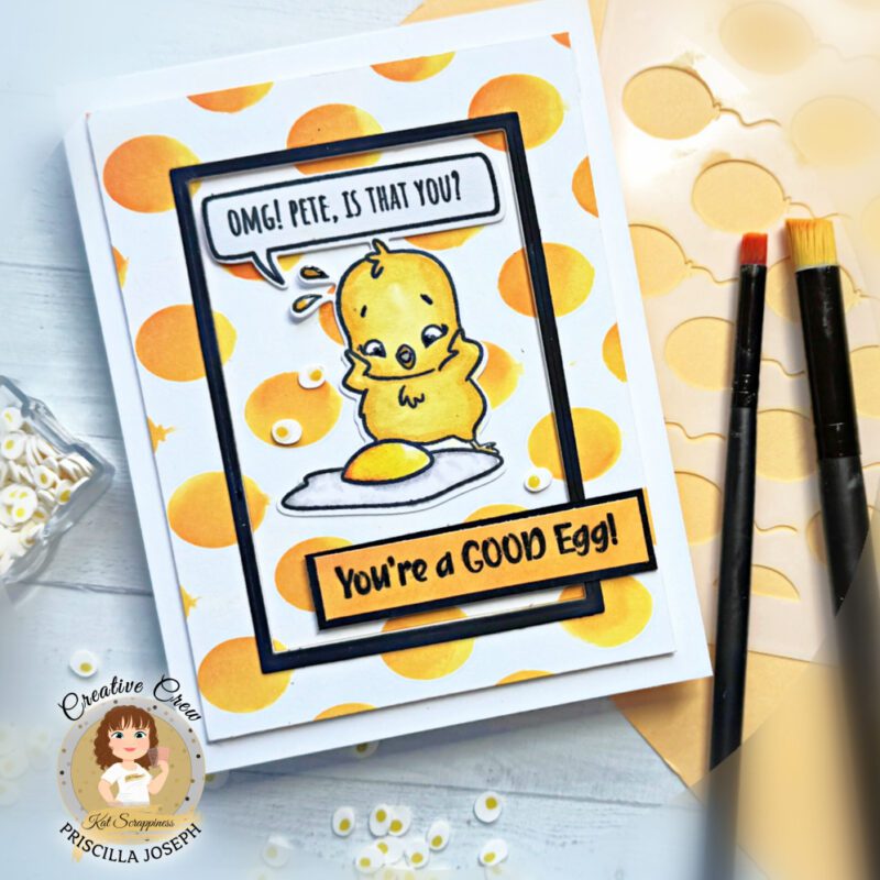 Hello Crafty Friends! Priscilla here from Nubble Light Designs. Today I am sharing a funny card featuring one of the images from the Kat Scrappiness “Easter Fun” stamp set. This poor chick just realized that his brother Pete met the somber demise that most eggs do. I created the bright background by using Kat’s “Party Balloons” stencil, BUT I turned it sideways to look like egg yolks! Then I used Kat’s new blending brushes to blend orange and yellow inks over the openings in the stencils. Viola! Not balloons anymore, but fried eggs!