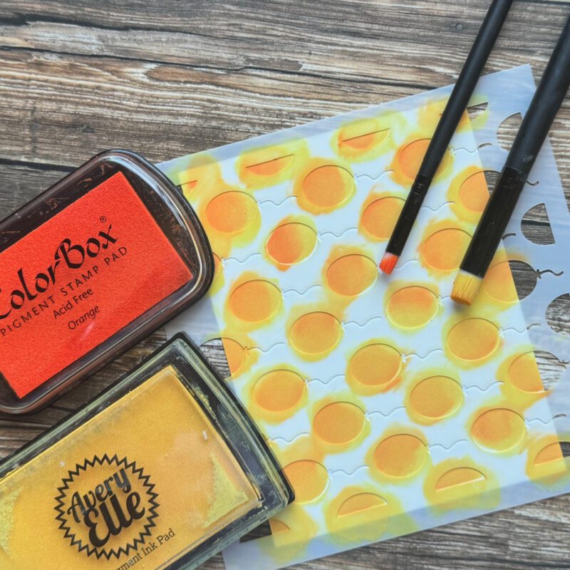 - Using the new Kat Scrappiness blending brushes, inked over the stencil openings with both orange and yellow pigment inks to turn the balloons into “fried eggs”, being careful not to ink up the balloon strings.