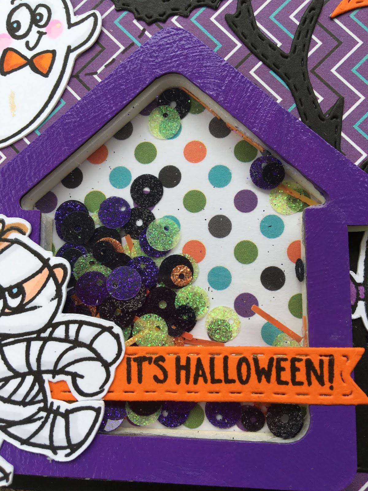 I painted my house frame from the House Shaker Kit with acrylic paint and sealed it with ModPodge. I glued the foam down to the patterned dot paper and added the Hocus Pocus Halloween Sequin Mix.