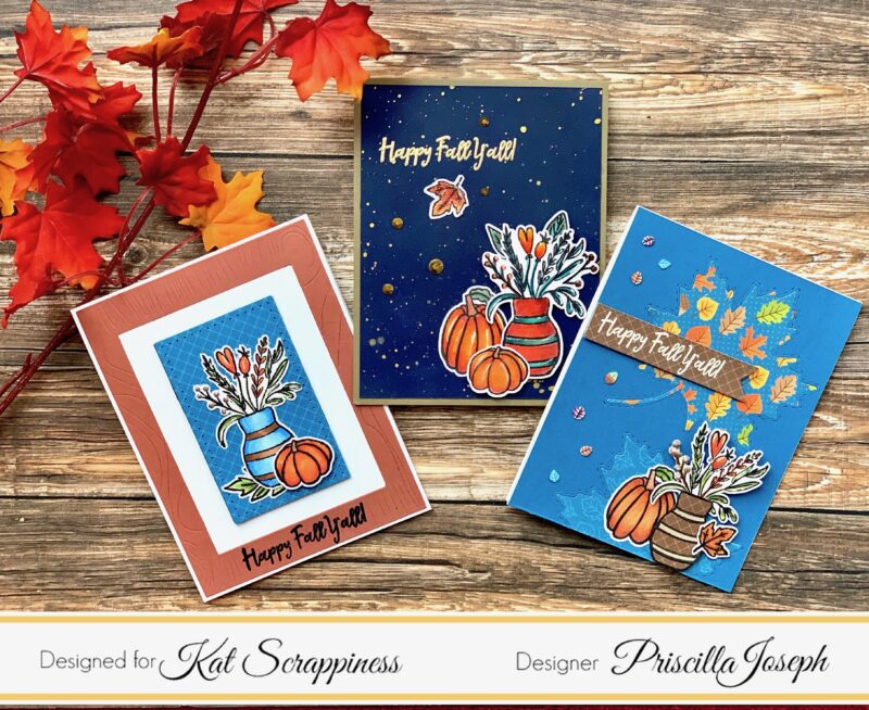 Hi Everyone, it’s Priscilla here. Today I have three fall-inspired cards using the Kat Scrappiness “Happy Fall Y’all” stamp set. Let’s get started!