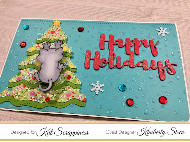 Hello Crafters! Kimberly here and it is my pleasure to be a Guest Designer for Kat Scrappiness. Today I am sharing a Christmas card which features the Stitched & Layered Christmas Tree Die by Kat Scrappiness; along with some wonderful products from her store.