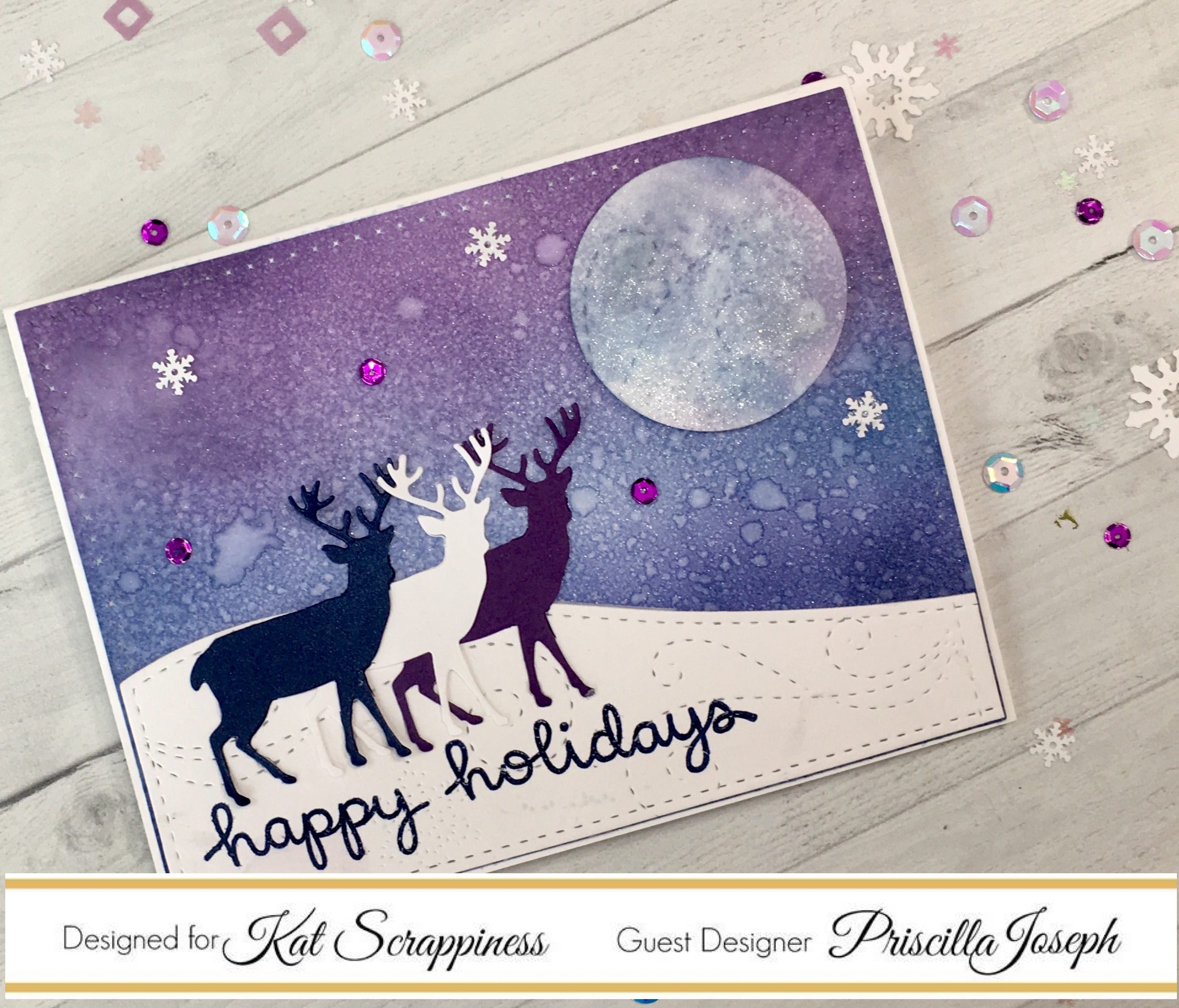 Note: I created the snow drifts by running white card stock through my “Big Shot” with the “Cut & Emboss” Stitched Snowflake Swirl Background Die and then running that die cut piece through again using the stitched snow drift die. The “happy holidays” sentiment is again from the Lawn Fawn‘s “Winter Scripty Sentiments” stamp set. I sprinkled the Kat Scrappiness “Sugarplum Fairies”sequin mix across the night sky for the finishing touch.