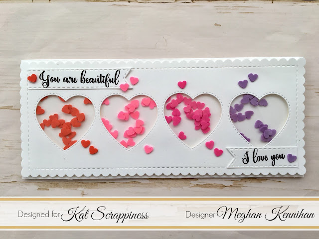 I added my Kat Scrappiness Acetate Sheets to the back of the slimline die and covering my hearts then layered on the foam tape around each heart die so that they each have their own little pocket for each of the different colors sprinkles.