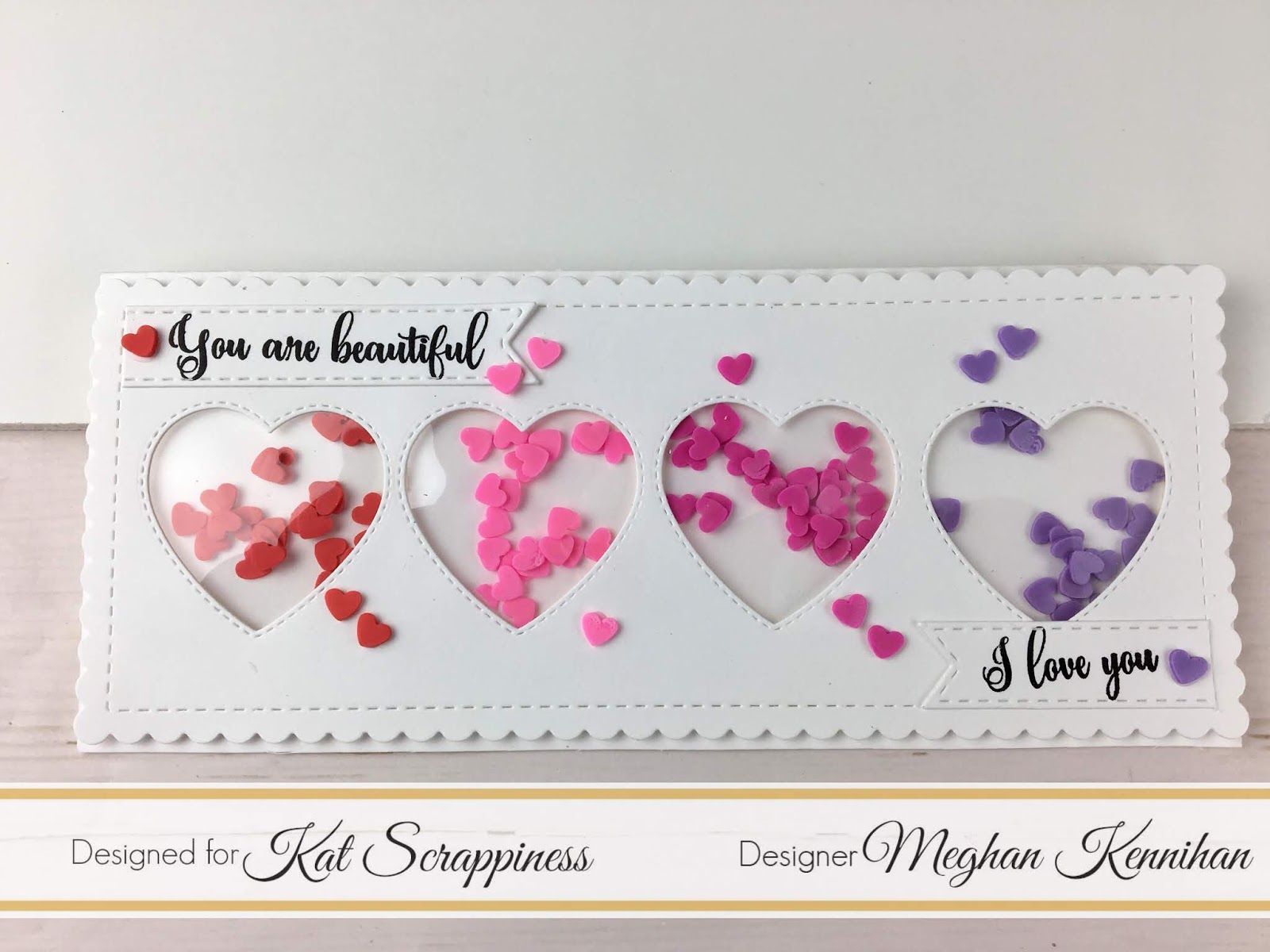 I pressed it down over my piles and shook it up to spread them around. Then I finished my card by gluing a few of the hearts on my panel and adding the sentiments from the Friendship Greetings Stamp set on Kat Scrappiness Stitched Fishtail Banner Dies.