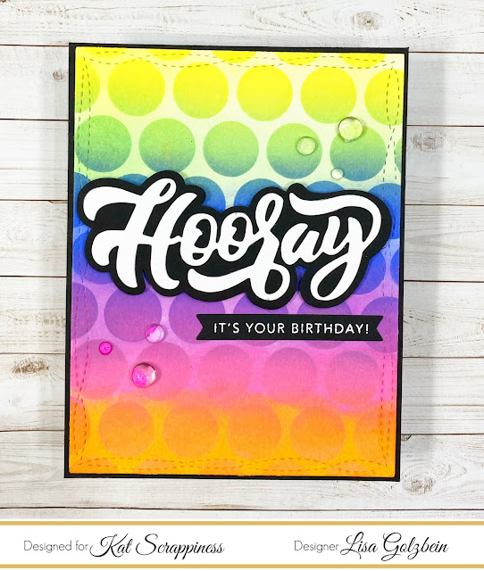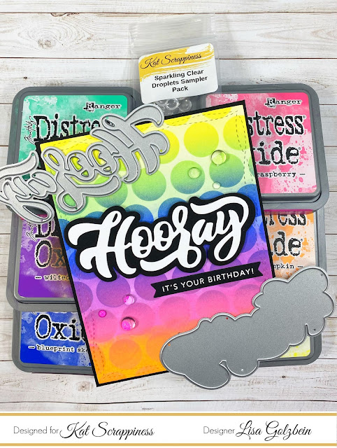 Next I used the largest die from the Wonky Wavy Stitched Rectangle Dies to cut a rectangle out from the ink blended panel. I then took the Kat Scrappiness Hooray with Shadow Die and cut the shadow layer out in black and the actual word layer out in white. The layers are so easy to put together because the shadow layer is the perfect matte for the word. I added in an extra sentiment under Hooray to make this a birthday card and then I decorated with my favorite embellishment from Kat Scrappiness, Sparkling Clear Droplets!