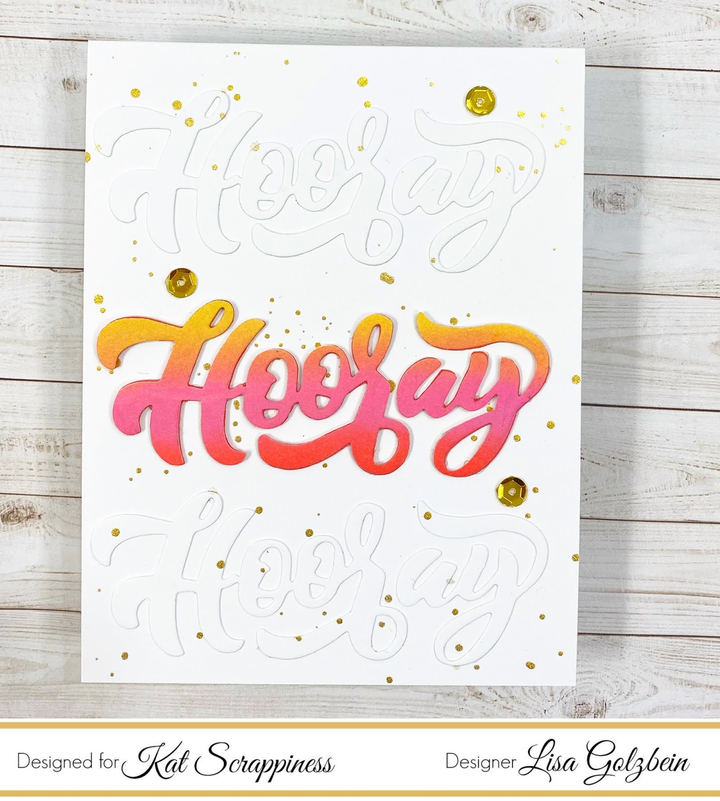 Once I had the blend the way I wanted I cut the word Hooray out of the panel. I just love how those 3 colors blend together to give a warm tropical look! I cut the word Hooray out 4 more times, twice in white and 2 more times in a coral color. I used the white words to give a tone on tone look by adhering them directly to the white card base and the 2 coral words I used to build up the ink blended Hooray die cut. Once I applied the two white Hooray cuts to the top and bottom of the card I did some ink splattering in gold using the Kuretake watercolor paint in gold to add some interest to the background of the card. Once the ink splattering was done I added the ink blended Hooray to the center of the card and finished off the card with some gold sequins