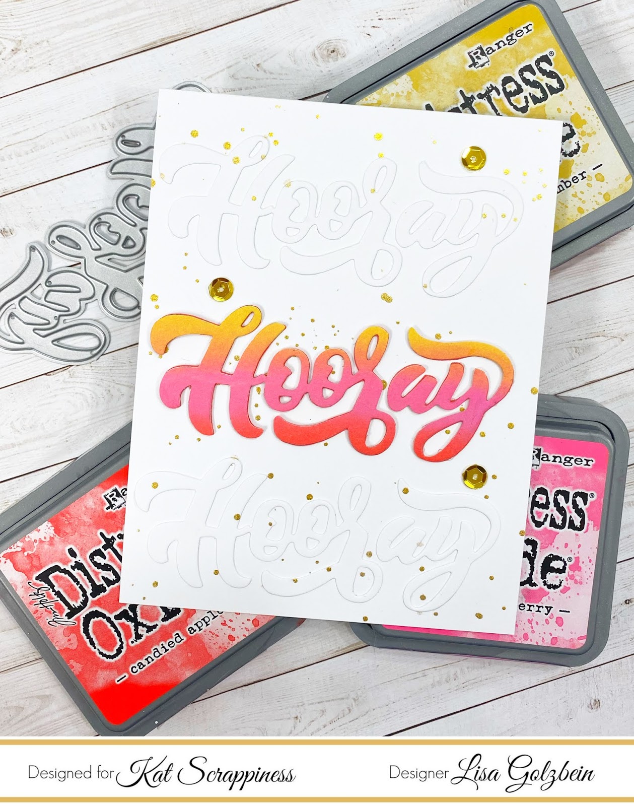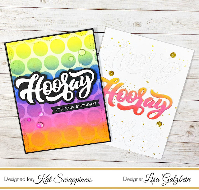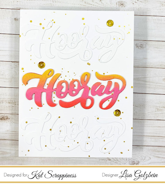 I love how versatile the Kat Scrappiness Hooray with Shadow Die is! It is large enough to stand alone on a card and be the main focal point. All you need is an interesting background and your card practically makes itself. I made 2 very different cards today with the Hooray die. One has lots of ink blending and stenciling in the background while the other is more of a clean and simple type of card.