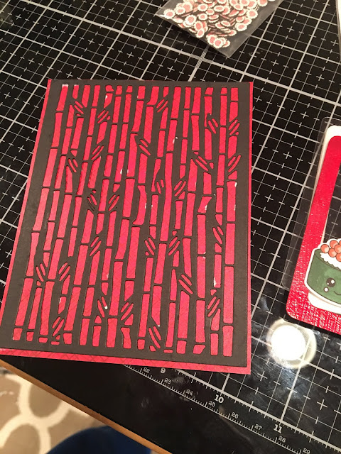 Next, I mounted the Bamboo Backdrop die on a fun Asian red background paper.