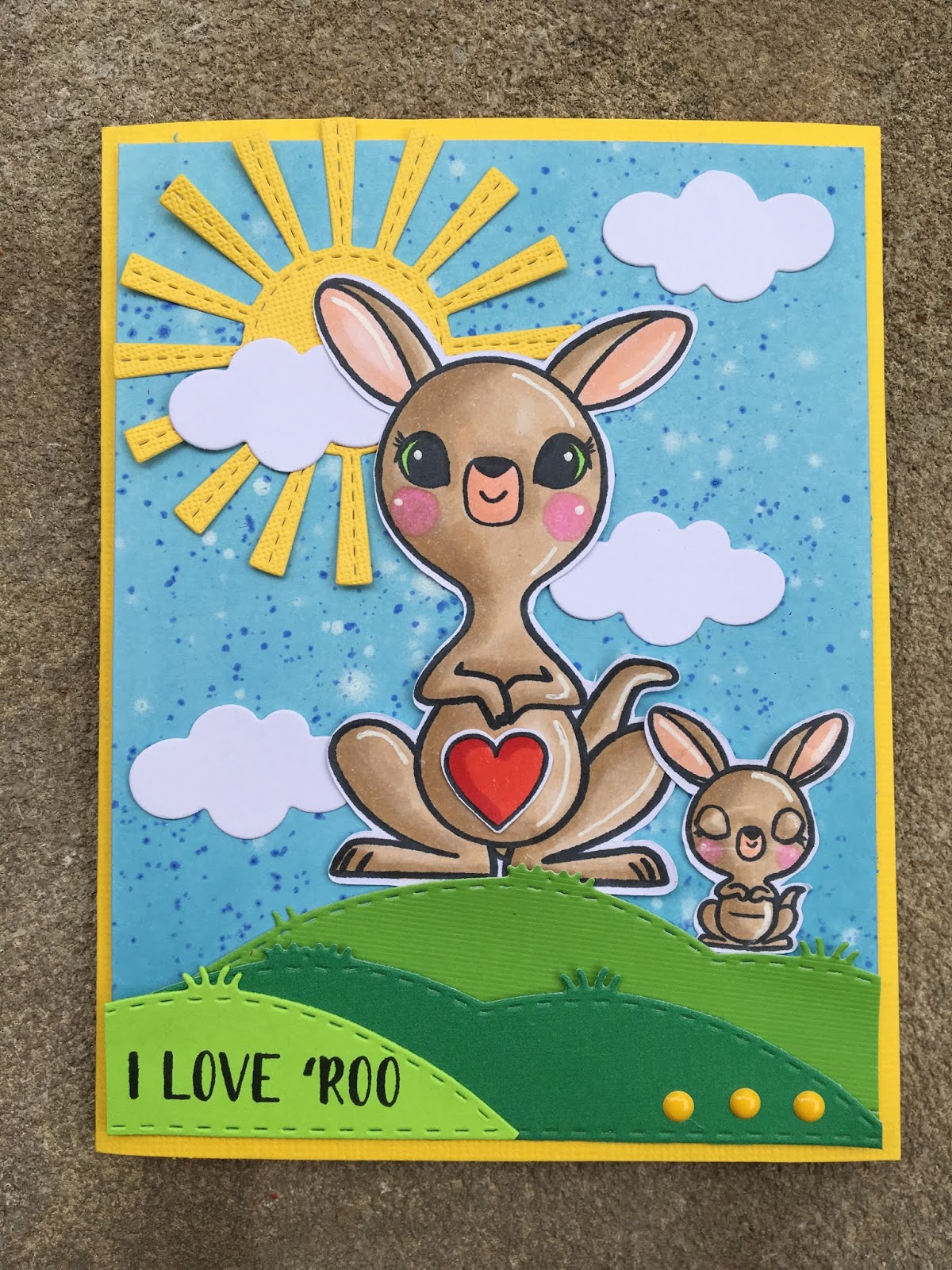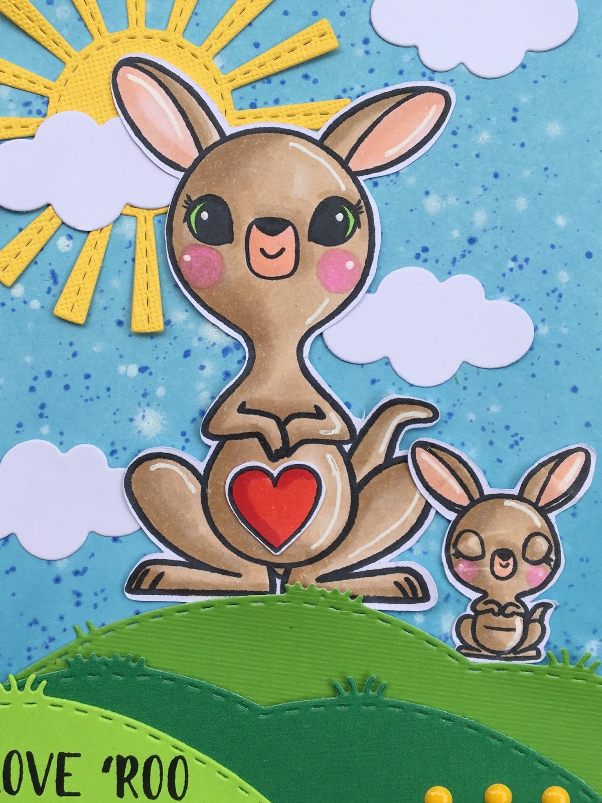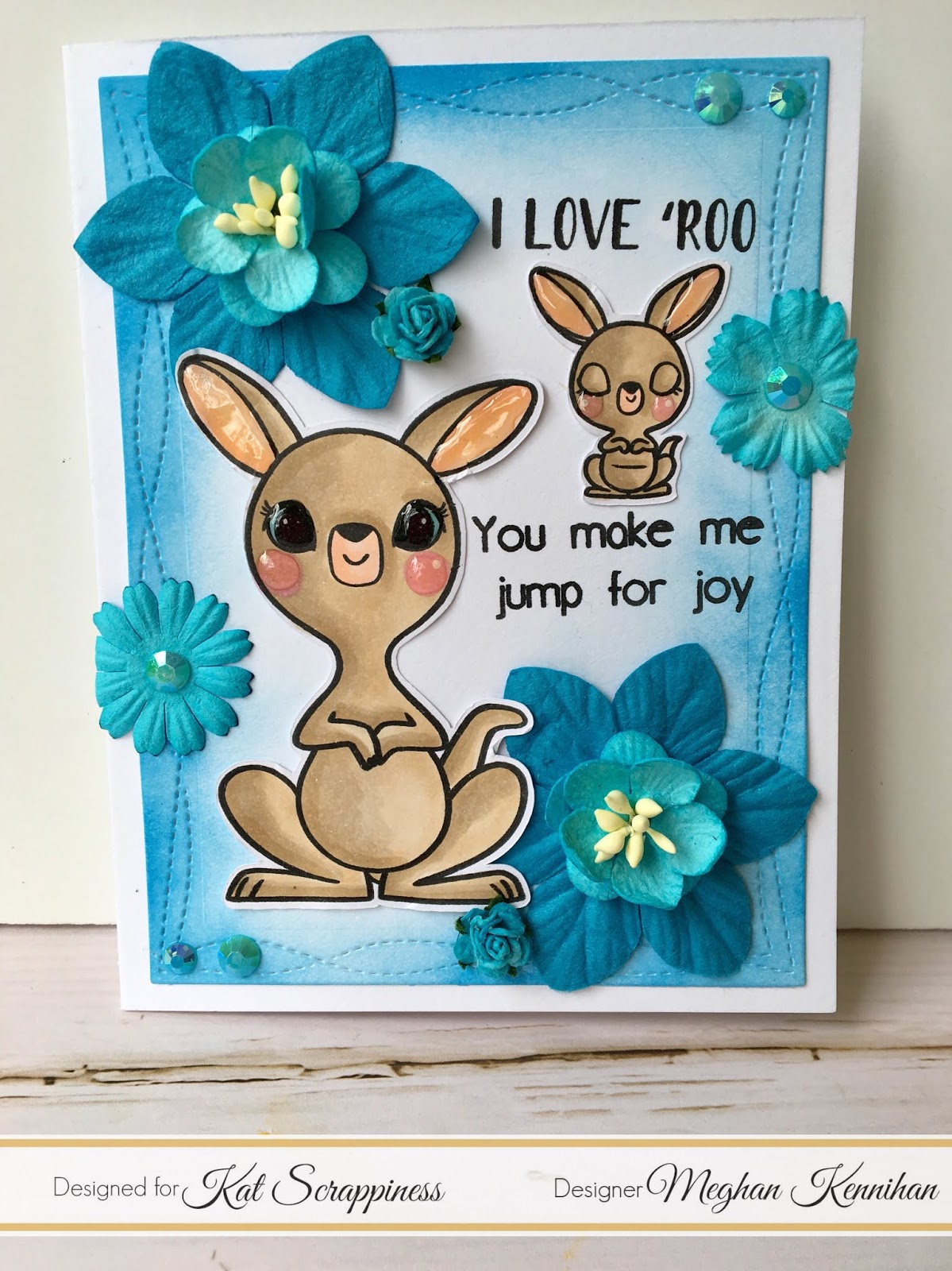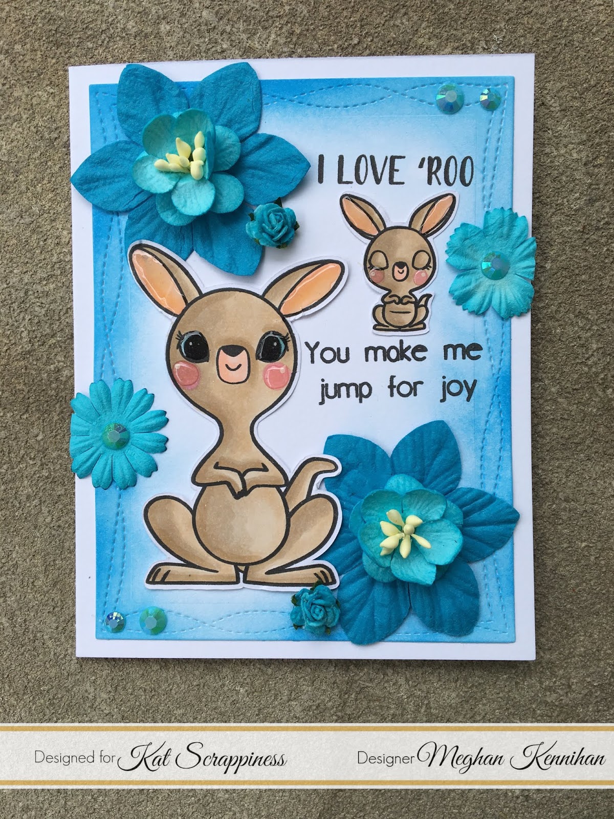 I started my card with the Kat Scrappiness Wonky Wavy Stitched Rectangle die. I inked the edges with Distress Oxide Salty Ocean Ink. I then arranged the flowers and kangaroos on my panel and glued them down. I finished the card with the fun sentiment and the jewels, then added some glossy accents to the ears, cheeks and eyes.