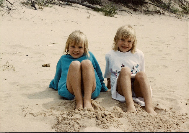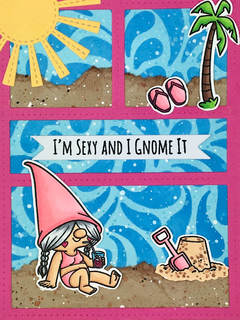 I have a fun summer scene for you today featuring Kat Scrappiness NEW Summer Gnomes stamp set. How cute is this little lady gnome and the fun pun sentiment? I managed to find some pictures of my twin sister and I chilling on the beach just like her (see below).