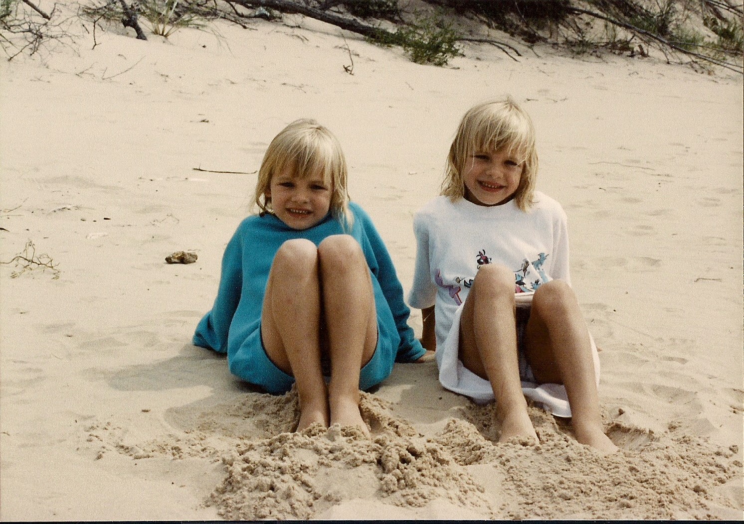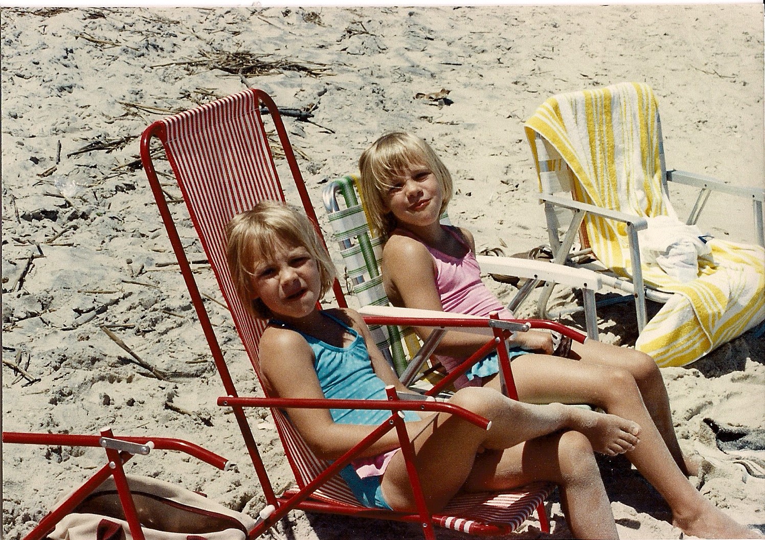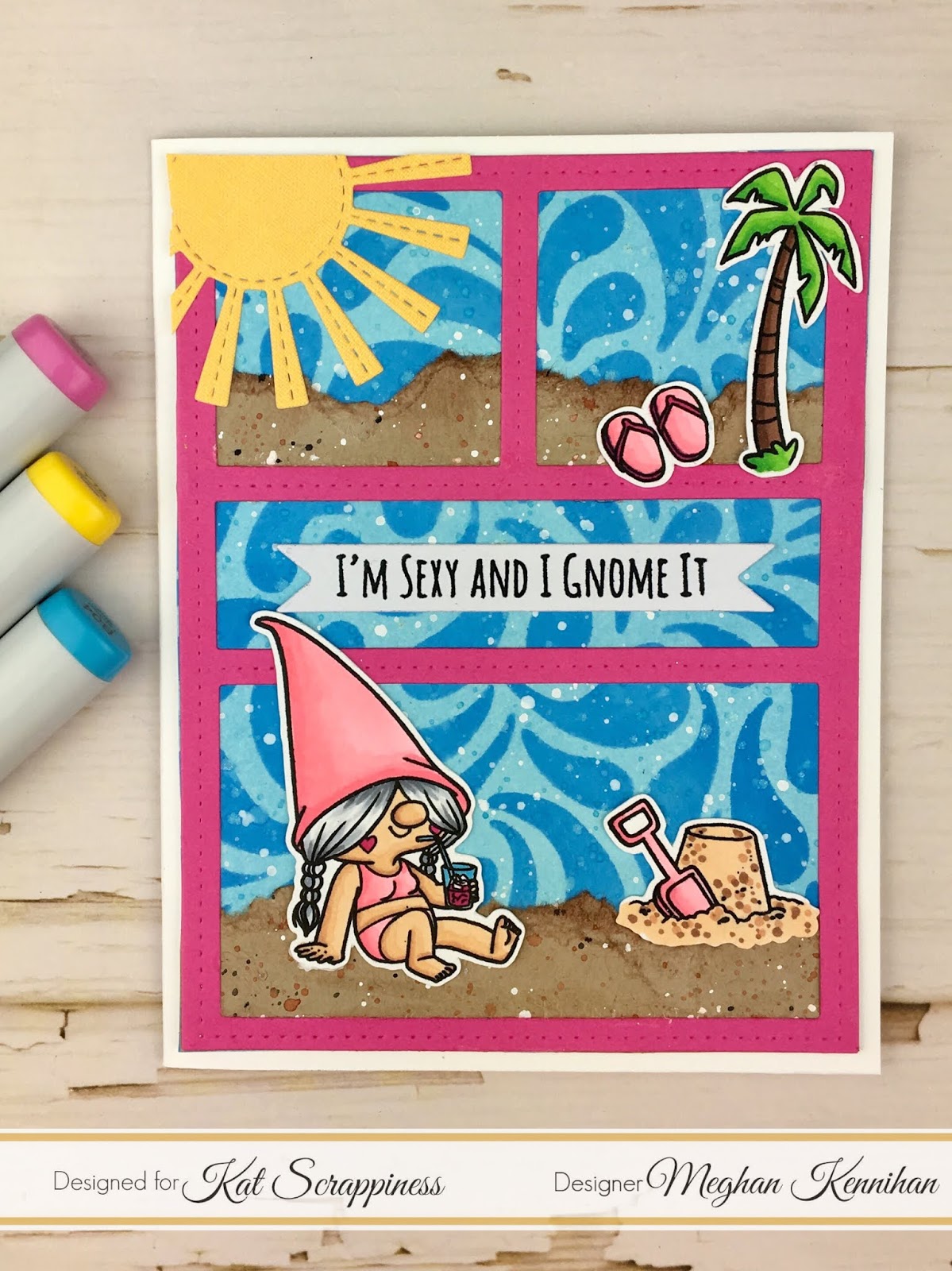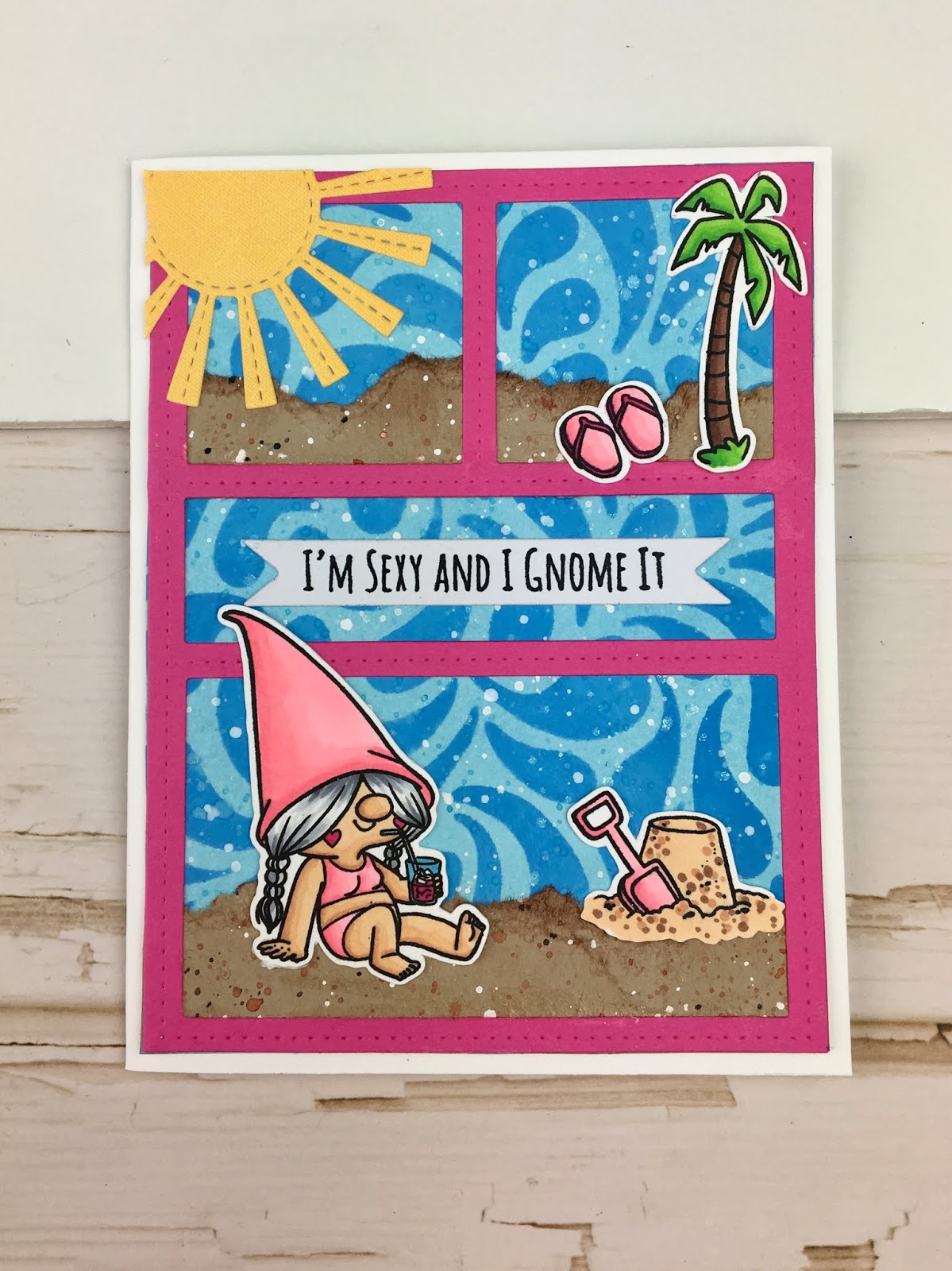 I have a fun summer scene for you today featuring Kat Scrappiness NEW Summer Gnomes stamp set. How cute is this little lady gnome and the fun pun sentiment? I managed to find some pictures of my twin sister and I chilling on the beach just like her (see below).