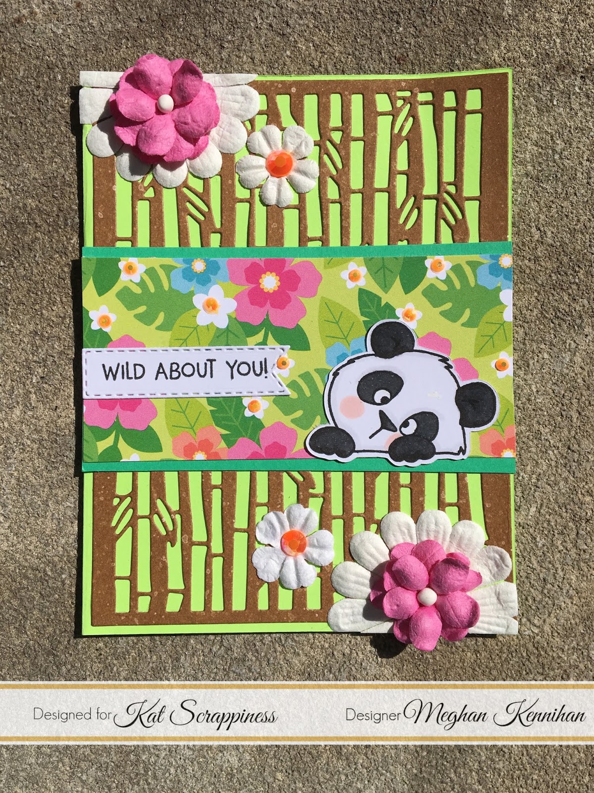 I cut my sentiment out using the Kat Scrappiness Stitched Fishtail Banner Dies and added the little panda to my tropical flower strip.