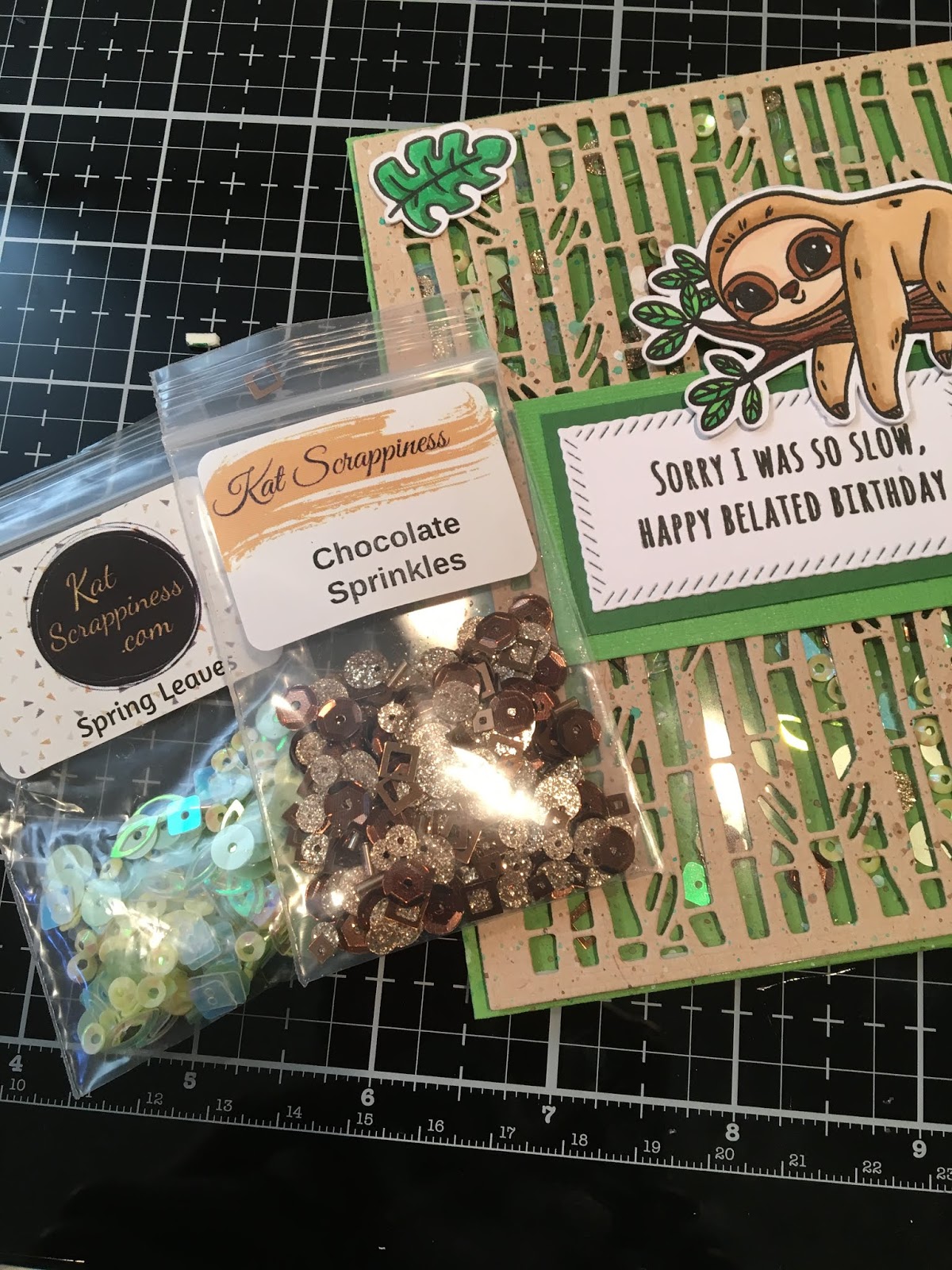I added my Acetate Sheet to the Bamboo Backdrop Die and then put the Spring Leaves Sequin Mix and Chocolate Sprinkles on my card to create my shaker piece.