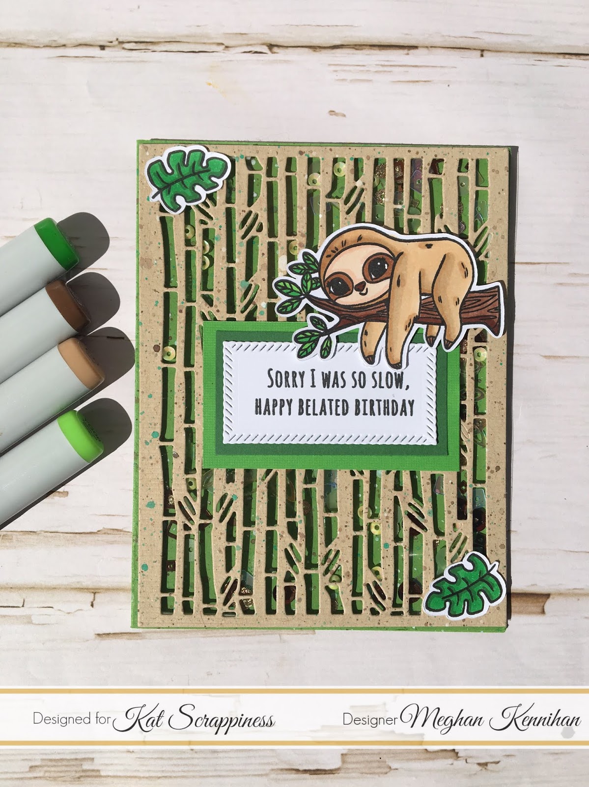 I created my base by just splattering it with the same watercolors. Then I colored up Stewart the Sloth and stamped the Belated Birthday Sentiment, die cutting it out using the Stitched Rope Rectangle Die.