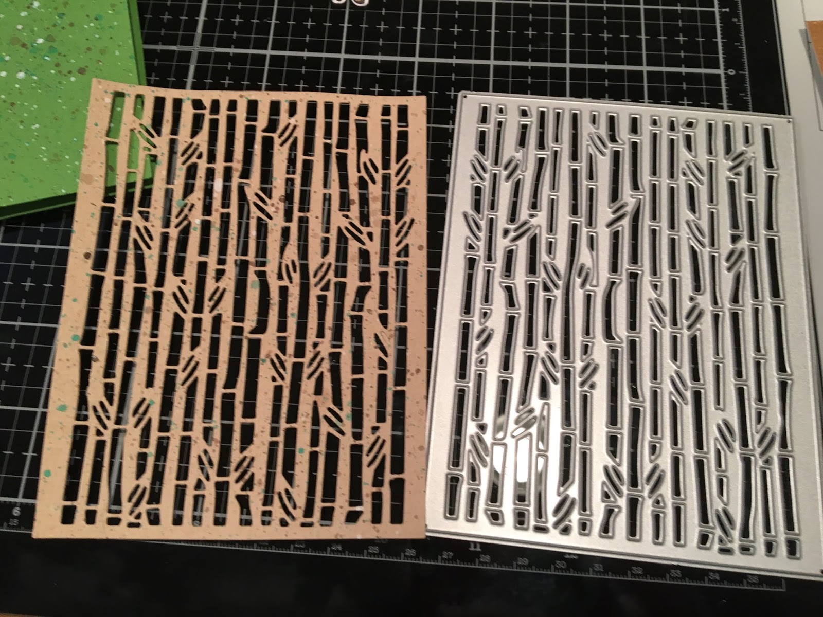 I started by die cutting my Bamboo Backdrop using kraft paper that I splattered with white, green and brown watercolors. It’s IMPORTANT to use a Metal Adapter Plate with this die because it’s VERY detailed. This adapter plate is AMAZING for all delicate and detailed dies. I HIGHLY RECOMMEND IT.