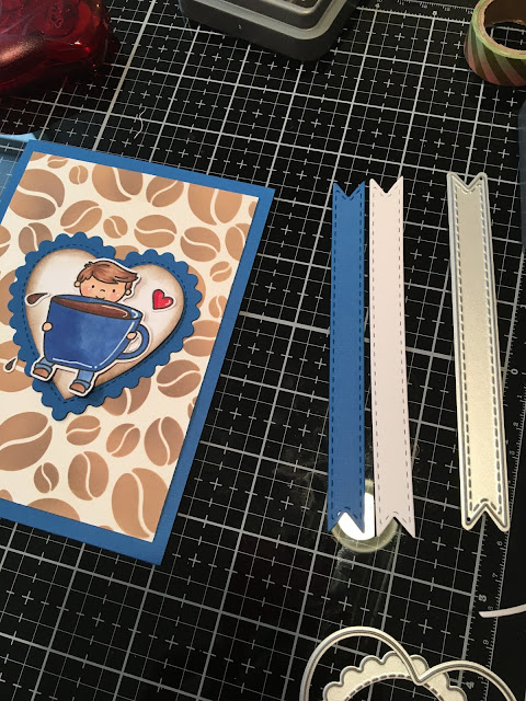 I colored the darling little man and mug with copic markers and foam taped him to the middle of the heart so he pops from the card. I stamped the sentiments onto a Kat Scrappiness Stitched Fishtail Banner die and added the sentiments to the top and bottom of my card.