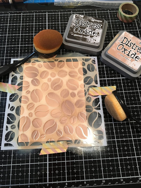 I started my card by creating the coffee bean panel with the Gina Marie Coffee Bean Stencil from the Kat Scrappiness Store. I used Tea Dye and Ground Espresso Distress Oxide Inks and blender brushes.
