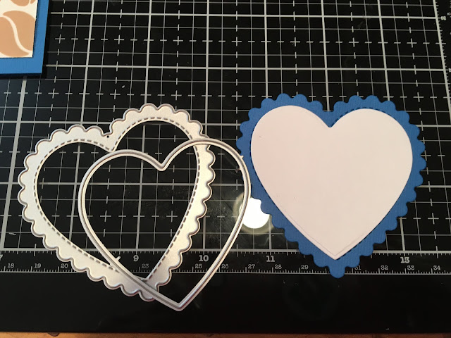 I taped it down to my blue base card. Then I die cut the wonderful Scallop Heart from the blue paper that matched my base and I die cut the white heart using the NEW Layering Heart Die Set (that goes with ALL Kat Scrappiness Heart Dies).
