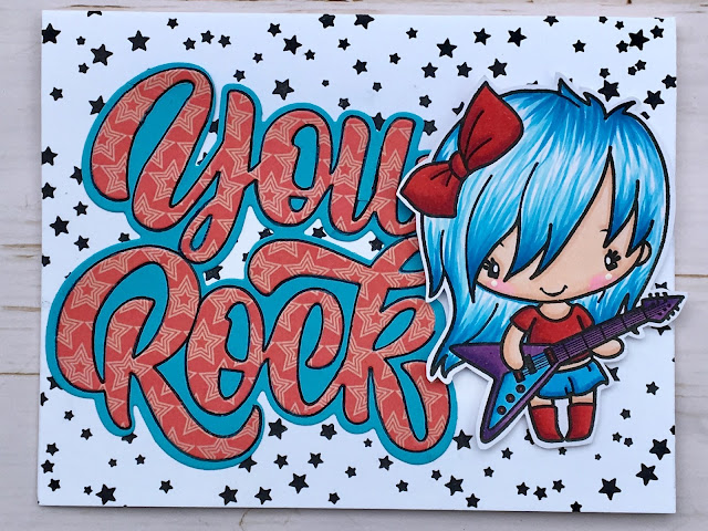 Are you ready for another fabulous challenge at Kat Scrappiness? This month is a color challenge. You know that July is all about the RED WHITE AND BLUE! So let’s see those colors on your creations! My inspiration for you is this little ROCKSTAR telling you that “You Rock” using the You Rock Sentiment with Shadow Die from the June Release!