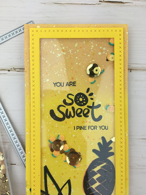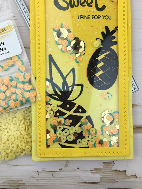 I am sharing some inspiration for the Kat Scrappiness September Challenge. This month’s theme is Slimline! Kat Scrappiness has SOOOOO MANY AMAZING Slimline dies and we want to see you use them! We have 3 NEW ones coming SOON too. I made a slimline Pineapple Shaker featuring the Cross Stitched Nesting Slimline Dies, Slimline Acetate, and all the fun Pineapple Sprinkles from Kat Scrappiness.