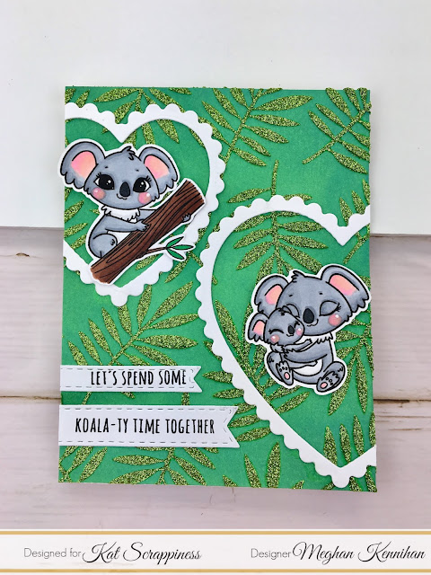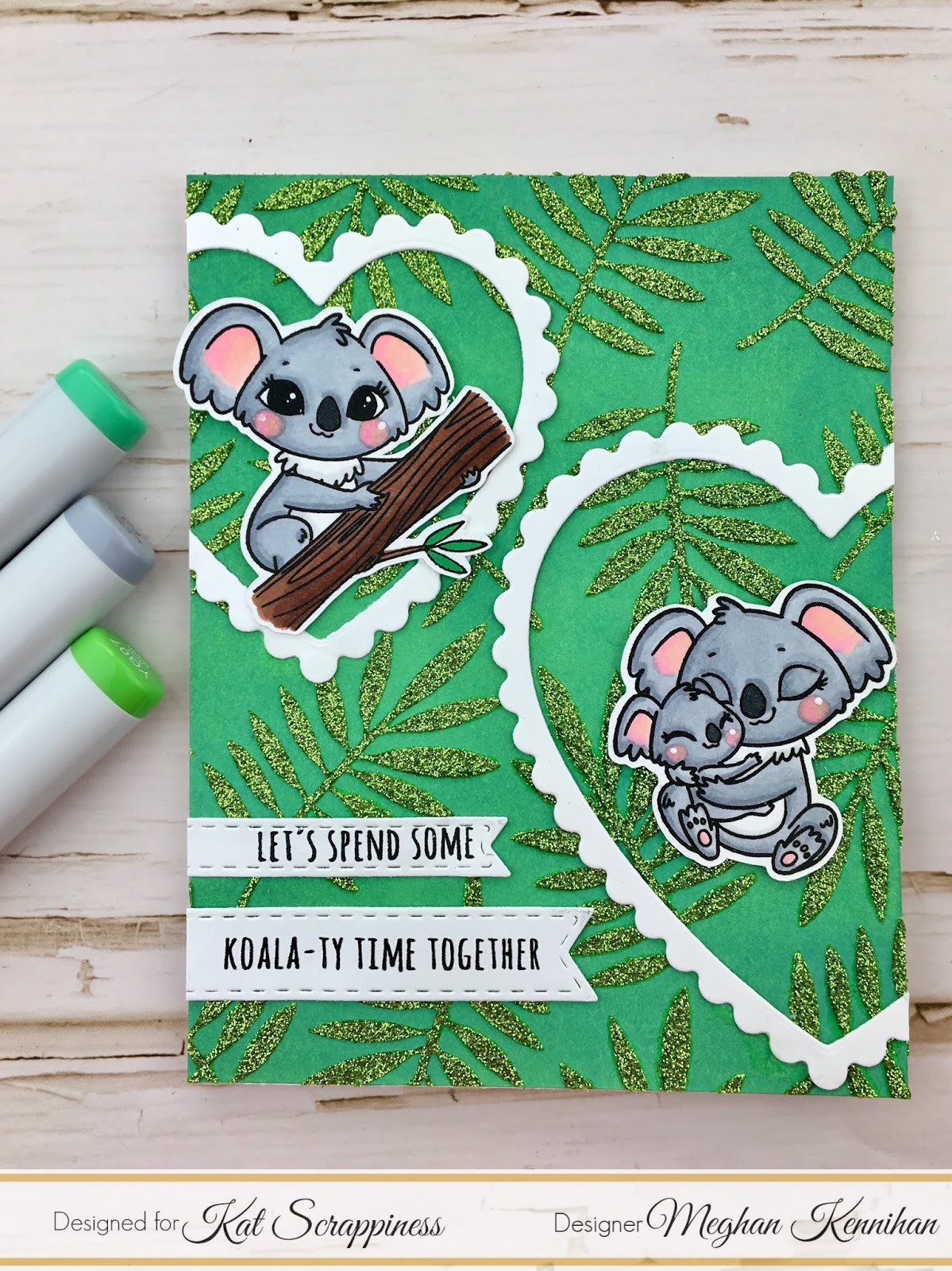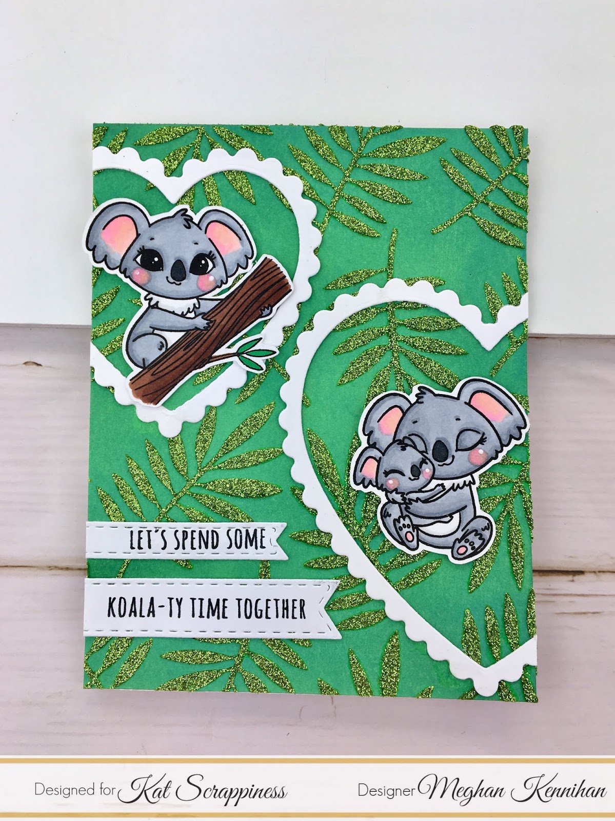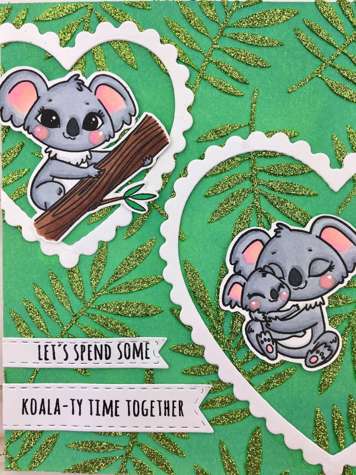 I have another KOALA card for you! Earlier this month I featured all the Kat Scrappiness Critters on one slimline card. If you missed that post, head here. Today, I wanted to just focus on the the Koala-ty Time Stamp set. I just love the little mother and daughter koalas. I created the background with Distress Oxide inks and green glitter gloss with a leaf stencil.
