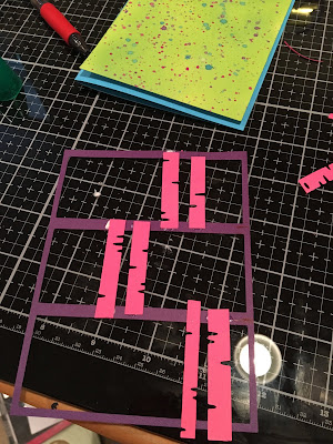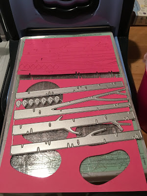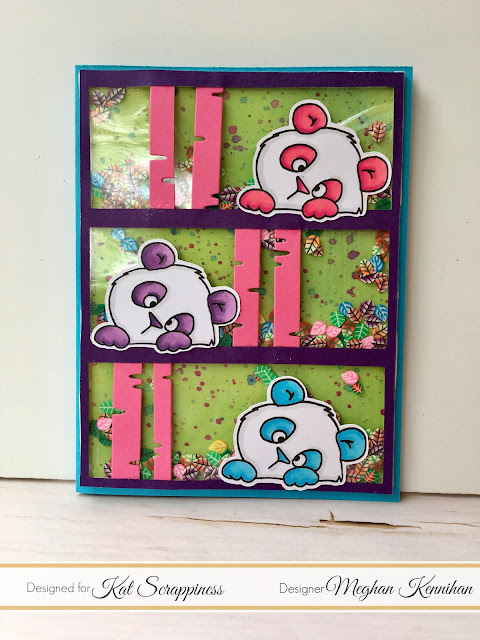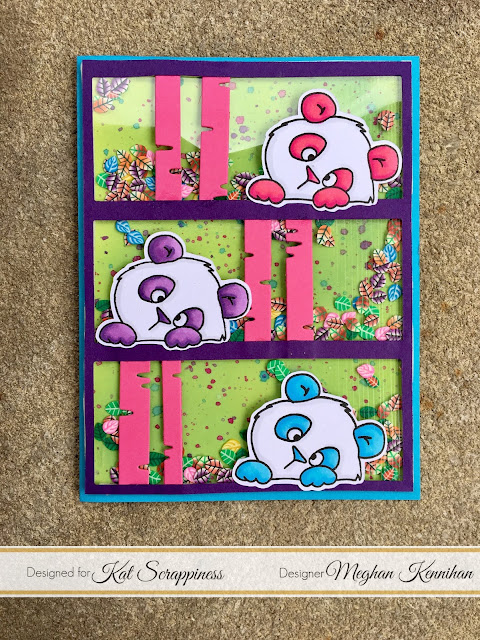 Next I made my shaker piece. I used Kat Scrappiness Stitched Rectangle Dies to cut out the rectangle windows for the pandas to sit in. Then I added the pink bamboo sticks (which is really the Kat Scrappiness Birch Tree Background Die but I just cut off the branches).