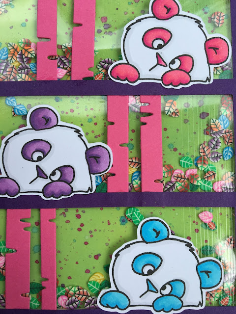I added my foam tape and my Mystical Leaves Sprinkles then finished my card by putting a panda in each little window.