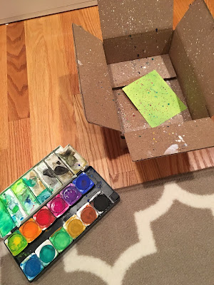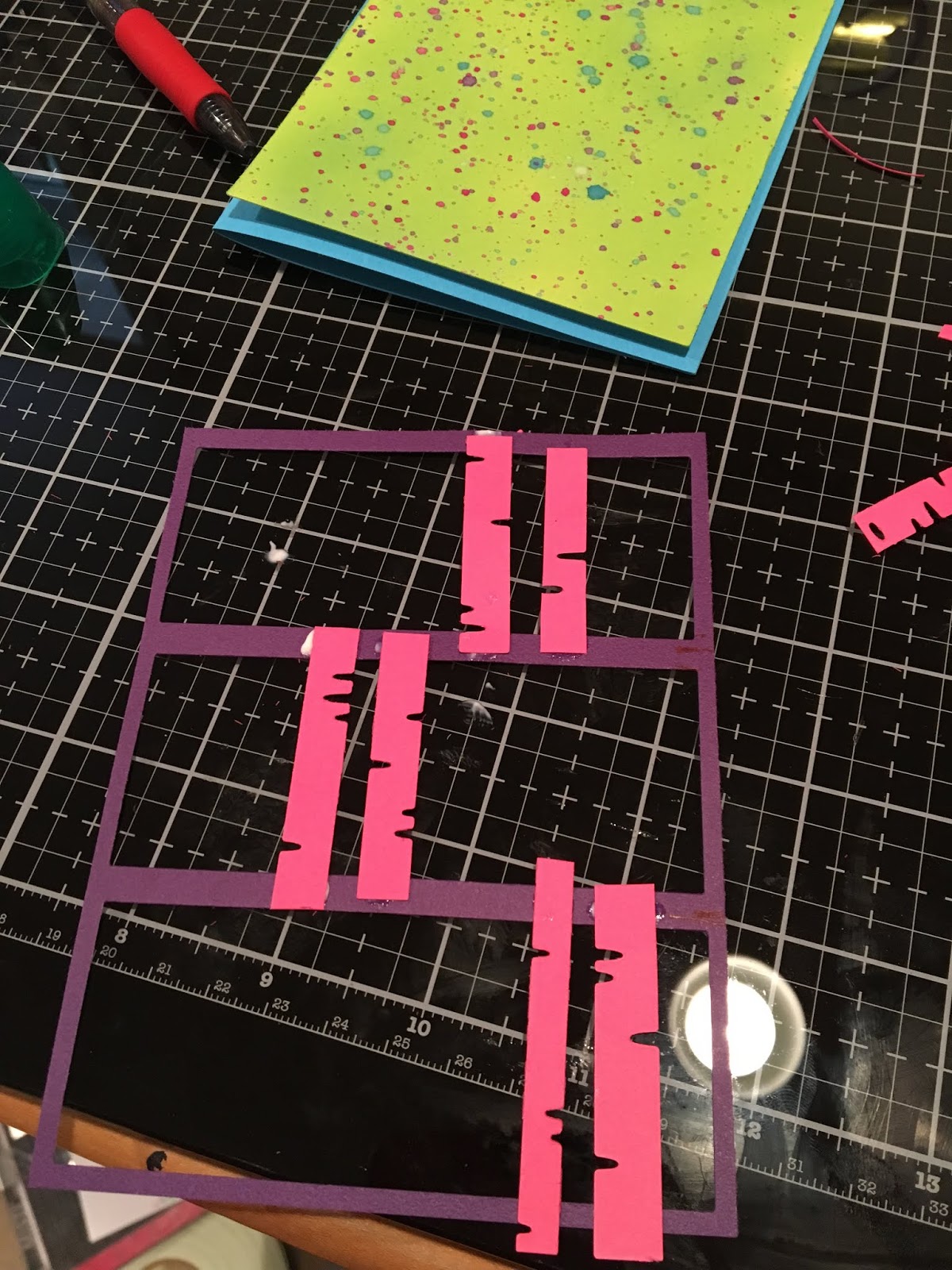 I started my card by creating the panel. I used Distress Oxide Inks to make a blended bright green background. Then I splattered it with watercolors to match the pandas I colored, so bright pink, blue, and purple.