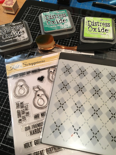 I started my card by using Distress Oxides to created the argyle plaid background. I then used my layering heart die to create a little frame for the avocados. I colored the cuties with copic markers and added glossy accents to the little seeds in the center.  I drew the little stitches around the heart to match the argyle stitches. Then I finished my card with the die cut hearts, sequins, and pun sentiment.