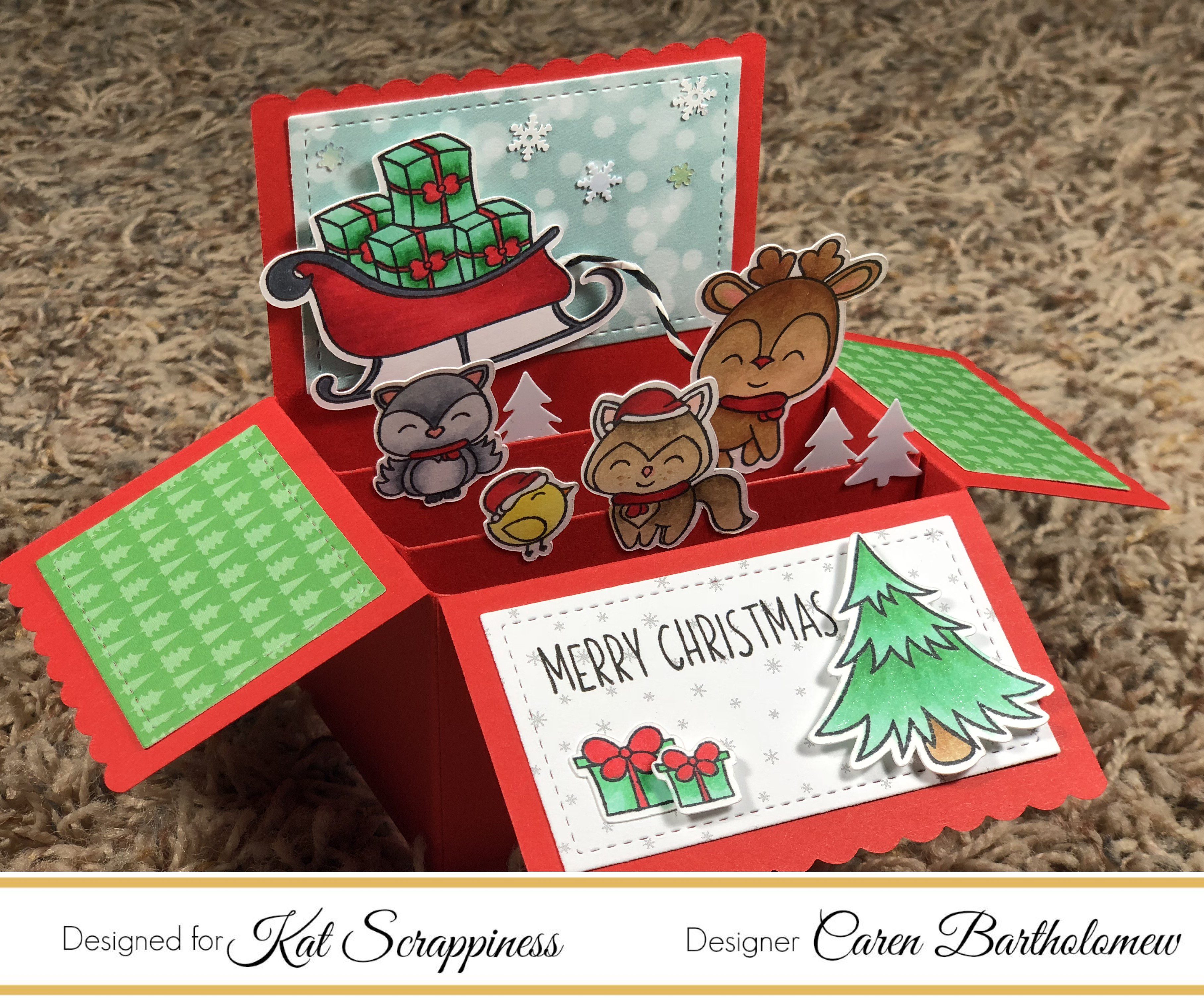 Today, I have a fun box card I made using the new Merry Critters stamp set from Kat Scrappiness. Box cards are so fun to make and receive! They are also pretty easy to make with so many options.